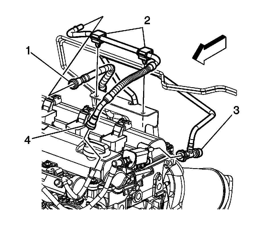 5. Disconnect the engine compartment fuel feed line quick connect fitting (4) from the fuel rail. Refer to Metal Collar Quick Connect Fitting Service.