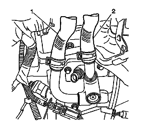 10. Remove the inlet (1) and outlet (2) heater hoses. Refer to Heater Inlet Hose Replacement and to Heater Hose Replacement - Outlet.