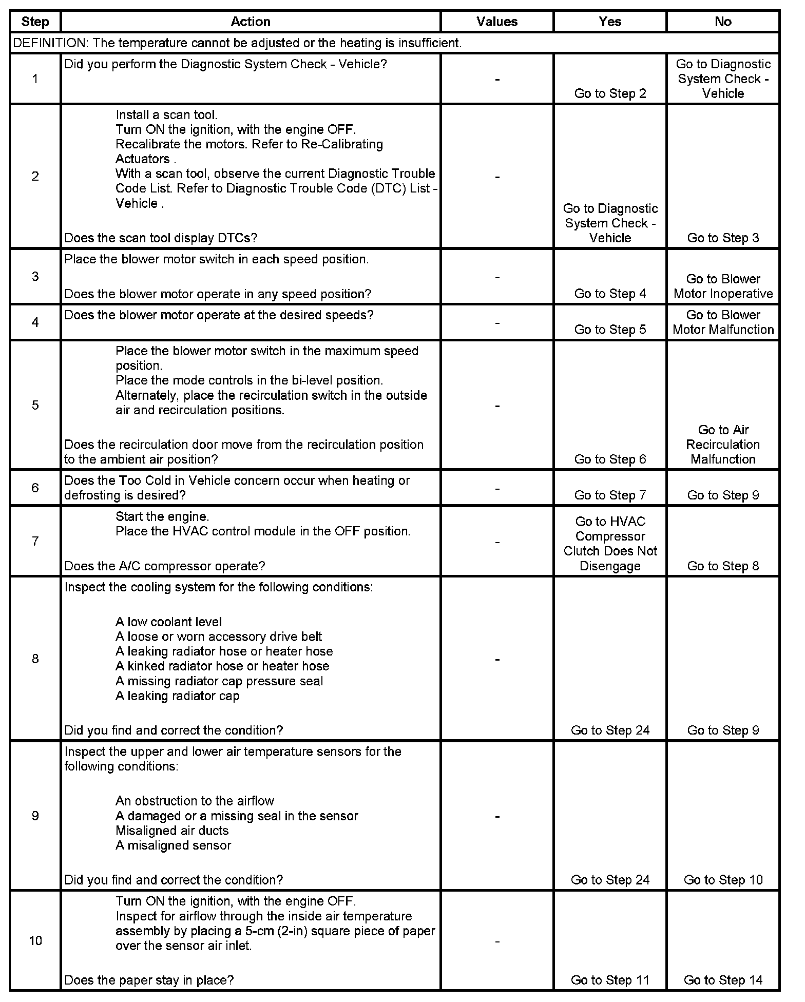 The numbers below refer to the step numbers on the diagnostic table.