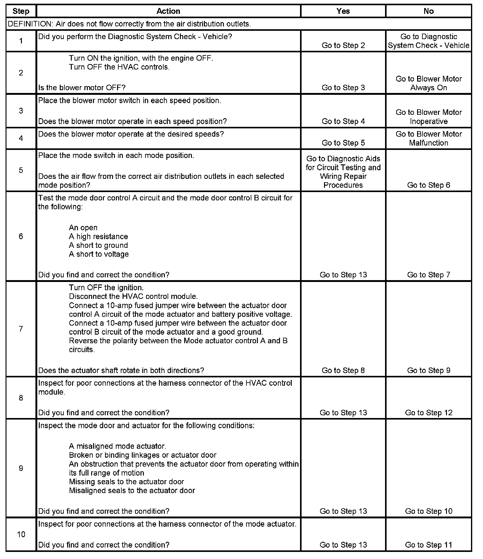 The numbers below refer to the step numbers on the diagnostic table.