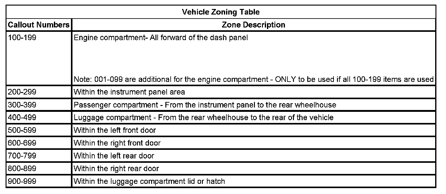All grounds, in-line connectors, pass-through grommets, and splices have identifying numbers that correspond to where they are located in the vehicle. The table explains the numbering system.