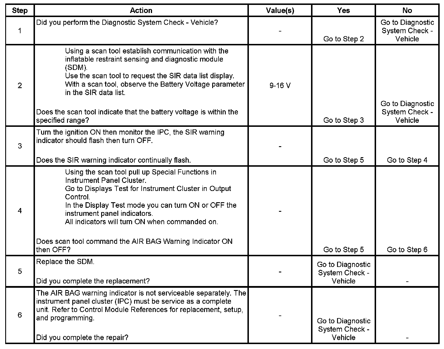 The ignition switch supplies ignition voltage to the inflatable restraint sensing and diagnostic module (SDM) using the SIR Fuse. The ignition switch also supplies ignition 1 voltage to the instrument panel cluster (IPC). The AIR BAG warning indicator is controlled by the SDM via GMLAN serial data. When the ignition switch is first turned ON, the SDM responds by performing tests on the SIR system and then commanding the AIR BAG warning indicator OFF after it has flashed 7 times if no trouble codes, DTCs, are found.