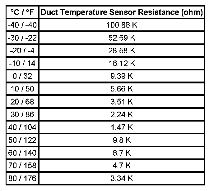 Sensor Resistance Table (Upper and Lower Duct Temp Sensors)