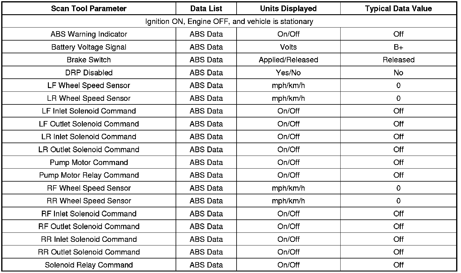 The EBCM Scan Tool Data Lists contain all the antilock brake system related parameters that are available on the scan tool. The parameters in the list are arranged in alphabetical order. The column, 'Data List,' indicates the location of the parameter within the scan tool menu selections.