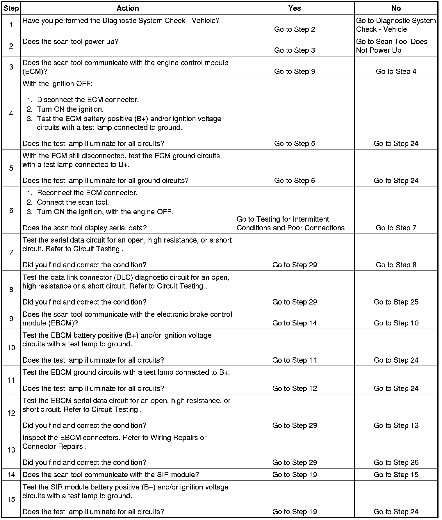 14. This step checks to see if the SIR system is not communicating with the scan tool.