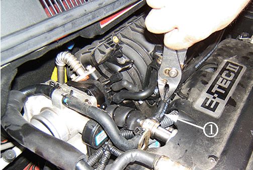 22. Install the original spring clamp and coolant outlet hose removed in Step 18.2 to the new PCV valve assembly port (1).