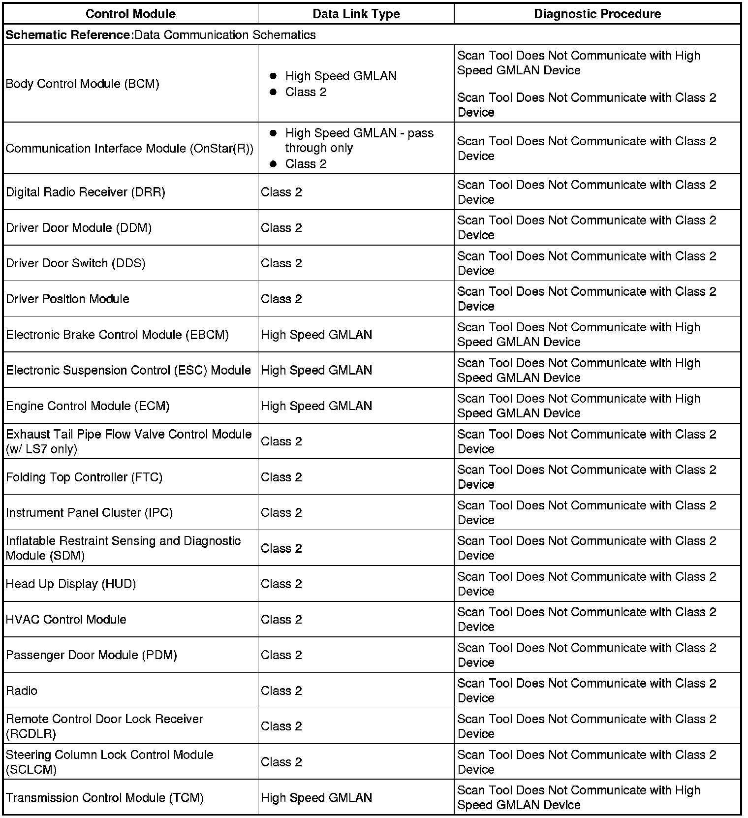 This table identifies which serial data link that a particular module uses for in-vehicle data transmission. Some modules may use more than one data link to communicate. Some modules may have multiple communication circuits passing through them without actively communicating on that data link. This table is used to assist in correcting a communication malfunction. The body control module (BCM) emulates some devices that are on high speed GMLAN serial data circuit to the modules on class 2 serial data circuit. The BCM transmits multiple Node Alive messages using source IDs that correspond to each of those high speed GMLAN nodes. This is in addition to the BCM behaving itself as a real node. For the description and operation of these serial data communication circuits refer to Data Link Communications Description and Operation (Description and Operation) .