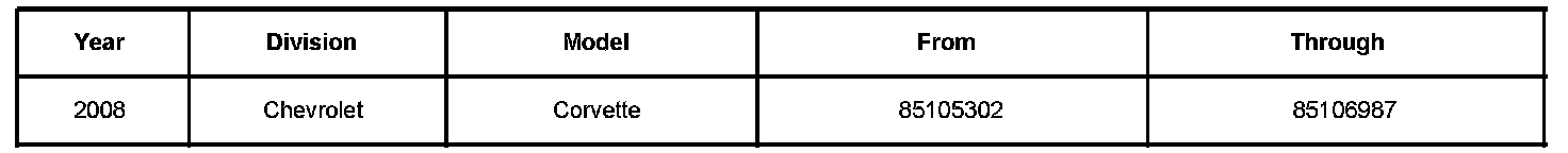 Involved are certain 2008 model year Chevrolet Corvette built within the VIN breakpoints shown.