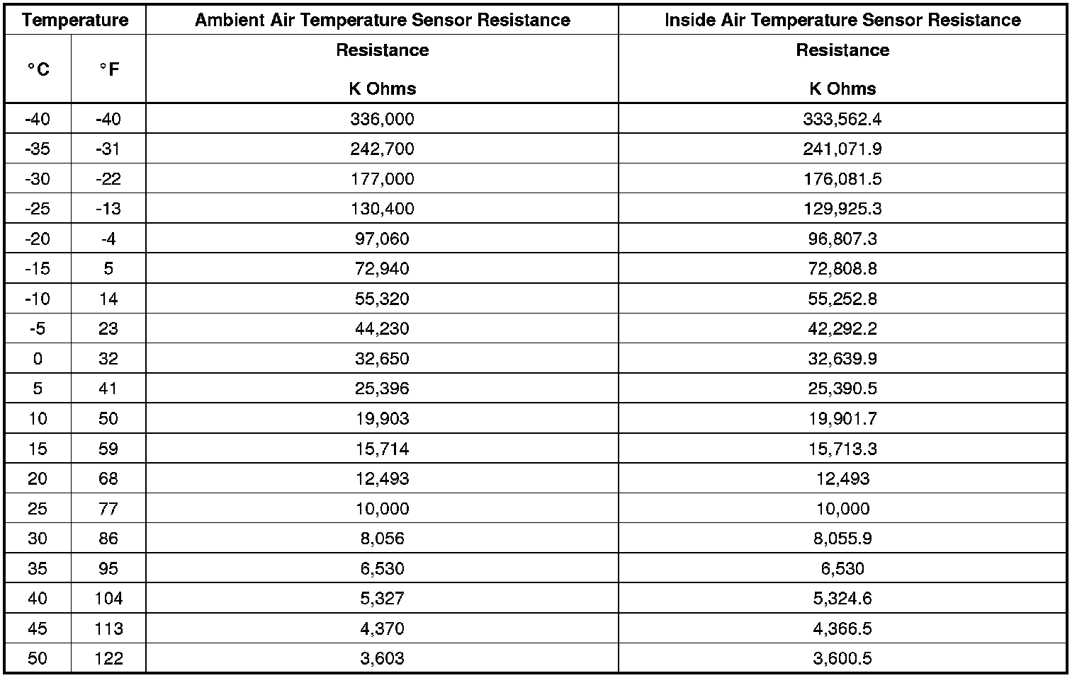 Sensor Resistance Table (Inside and Ambient Air Temp Sensor)