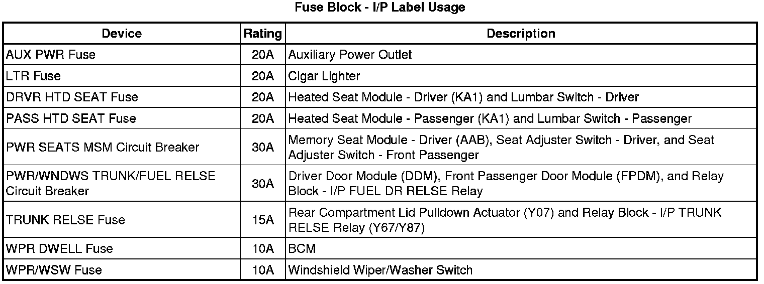 Fuse Block - I/P, Relay Block - I/P and BCM Label