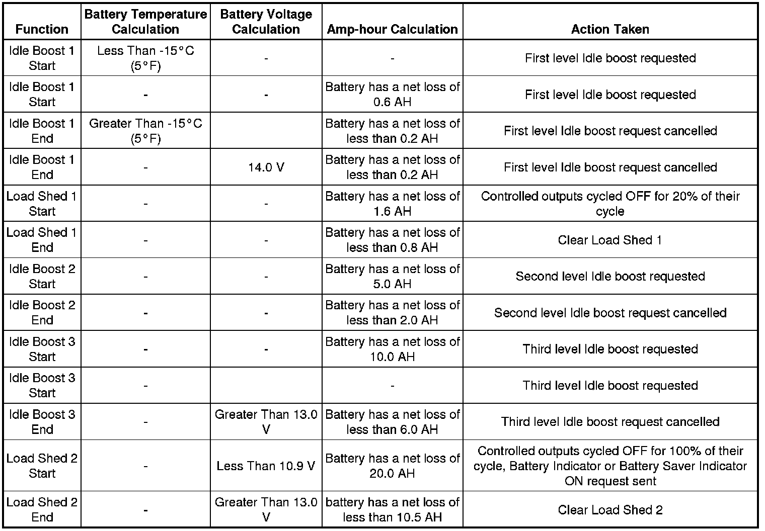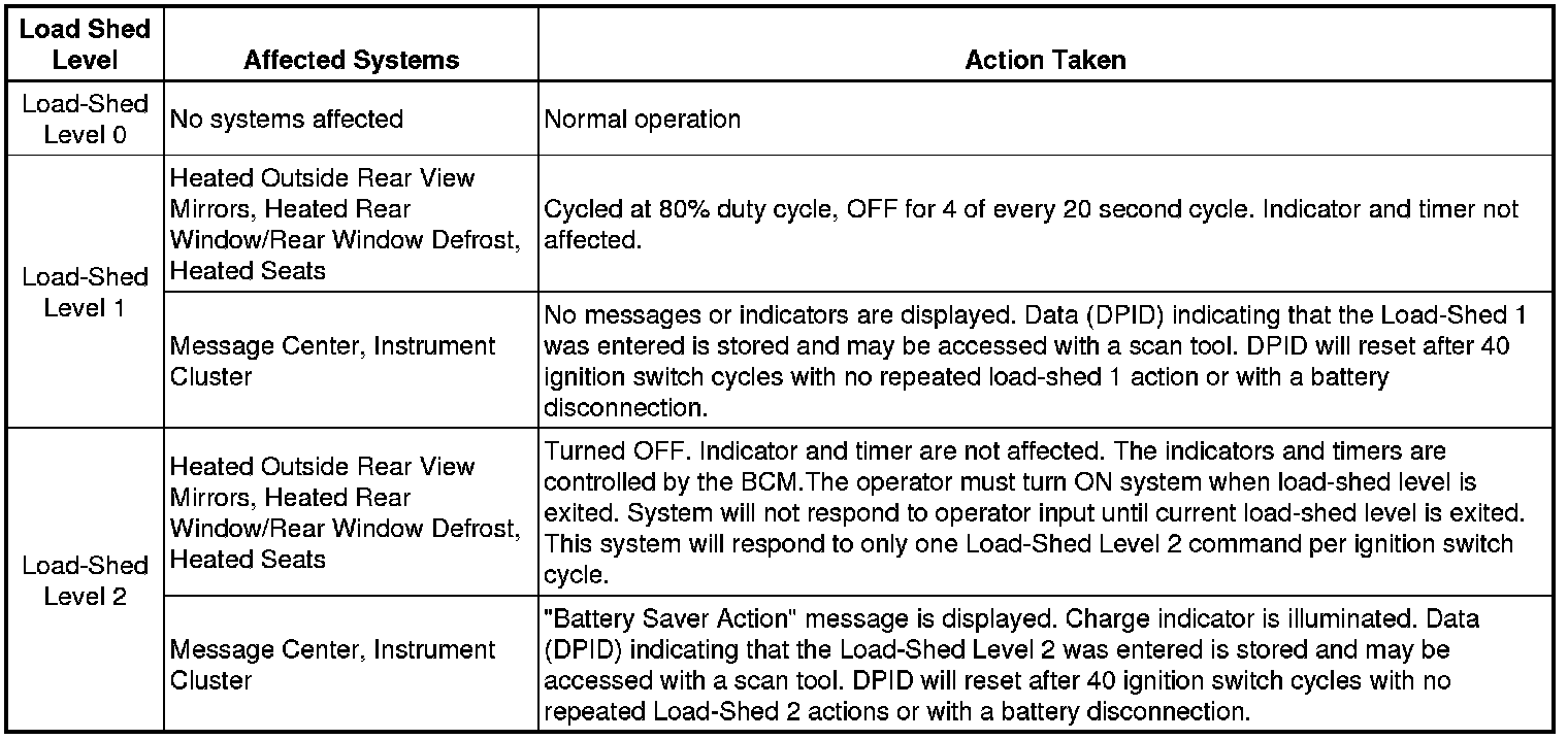 The BCM will either request an increase in the engine idle speed from the ECM or the BCM will turn off loads, called the load-shed function, in order to preserve the vehicle electrical system operation. The criteria used by the BCM to regulate this electrical load management are outlined below: