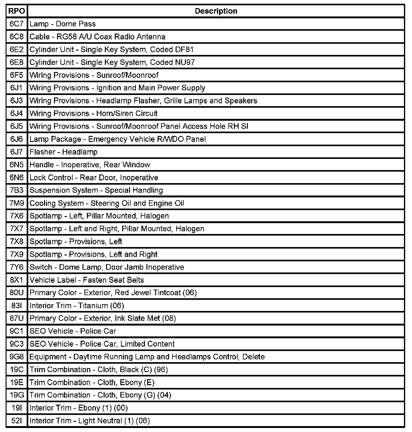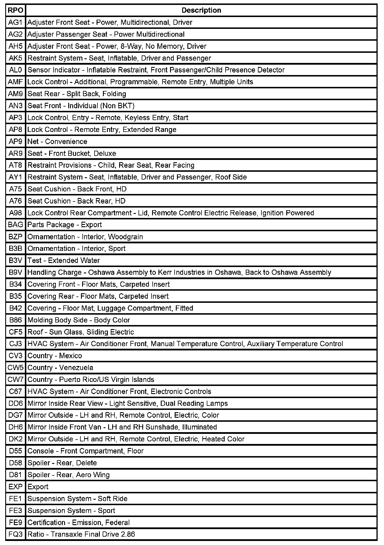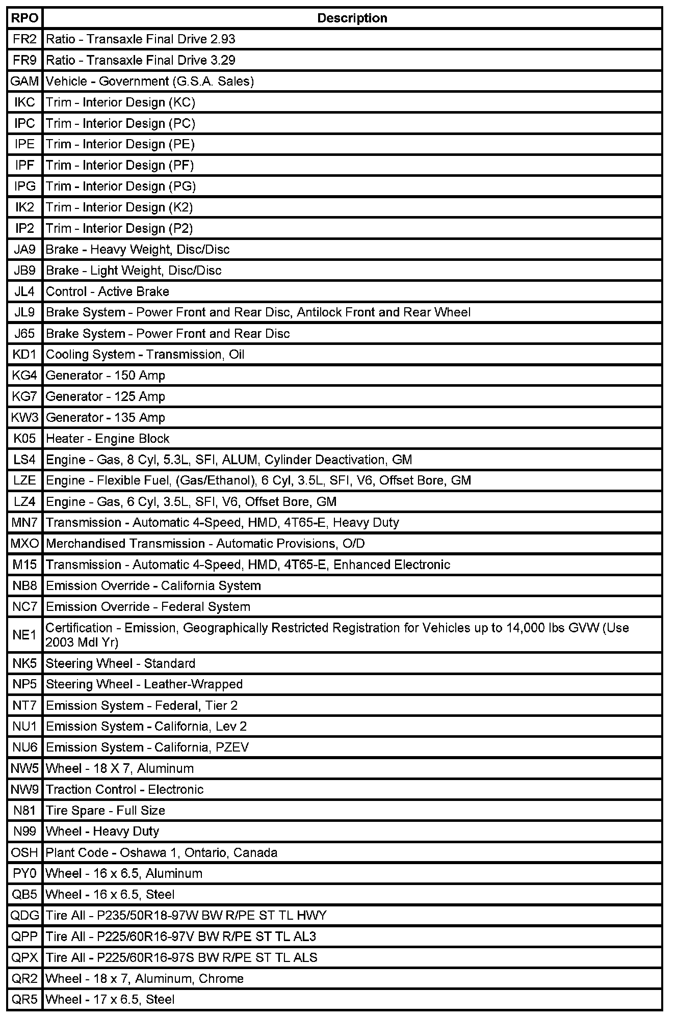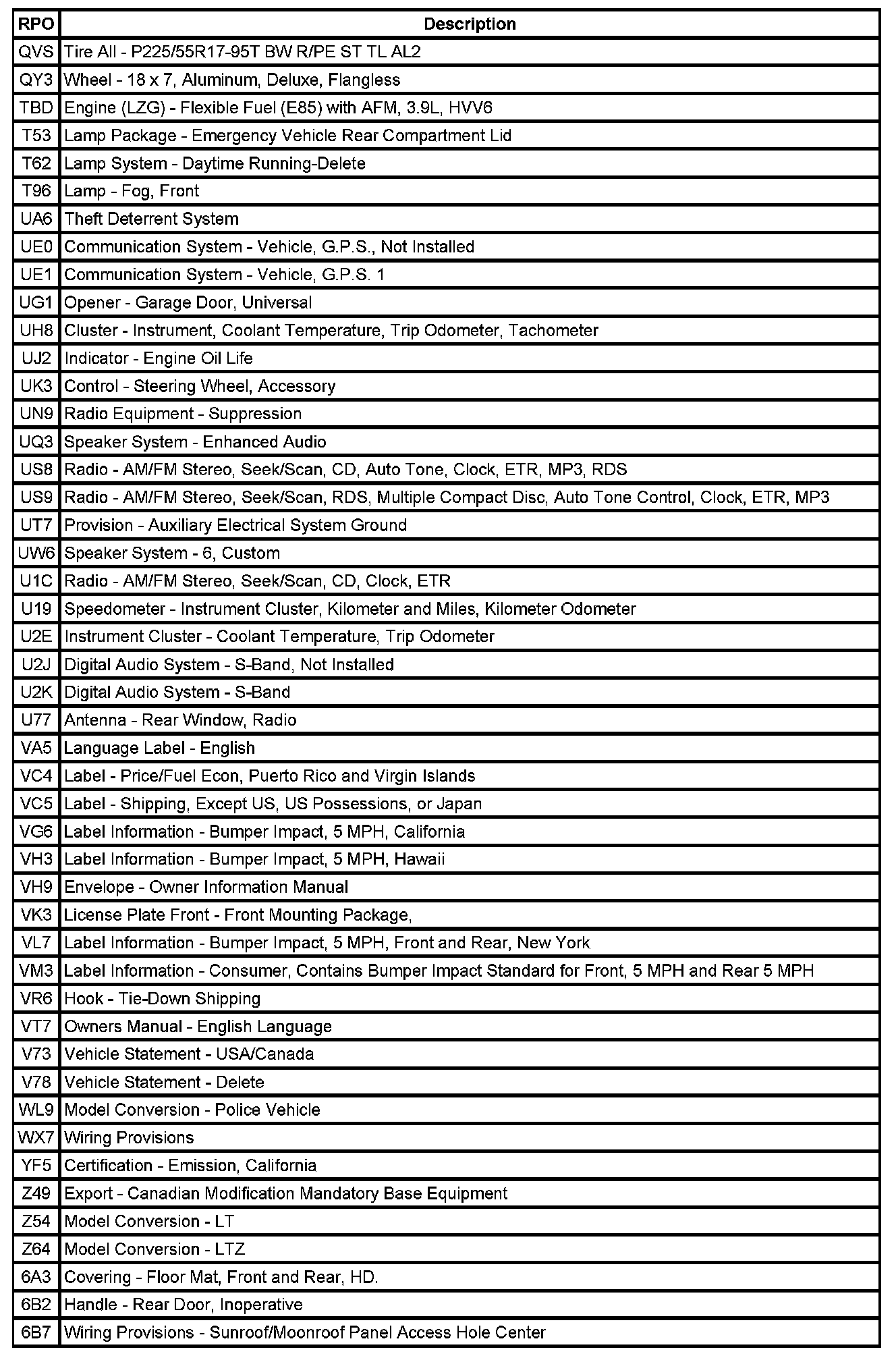The following table provides the description of the Regular Production Option (RPO) codes that are available on the vehicle. The vehicle's RPO list is printed on the Service Parts Identification Label.