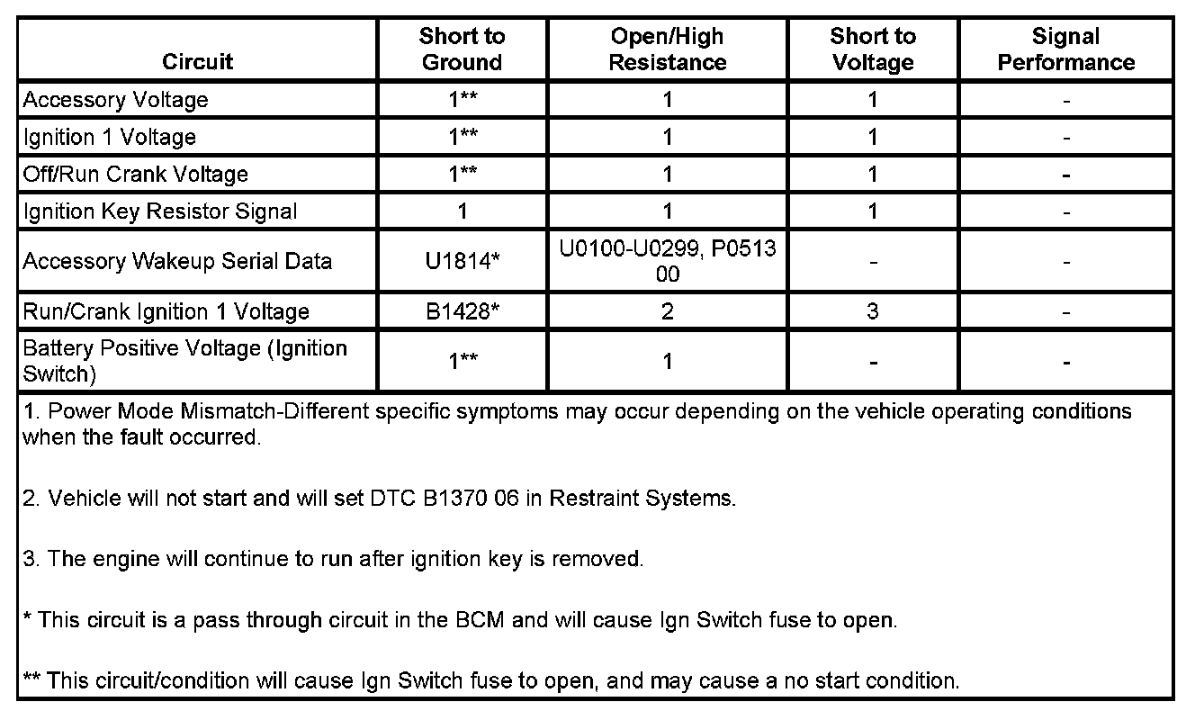 * A short to ground in the run/crank ignition 1 voltage circuit of the run crank relay will cause an open fuse to the ignition switch. DTC B1428 should be current.