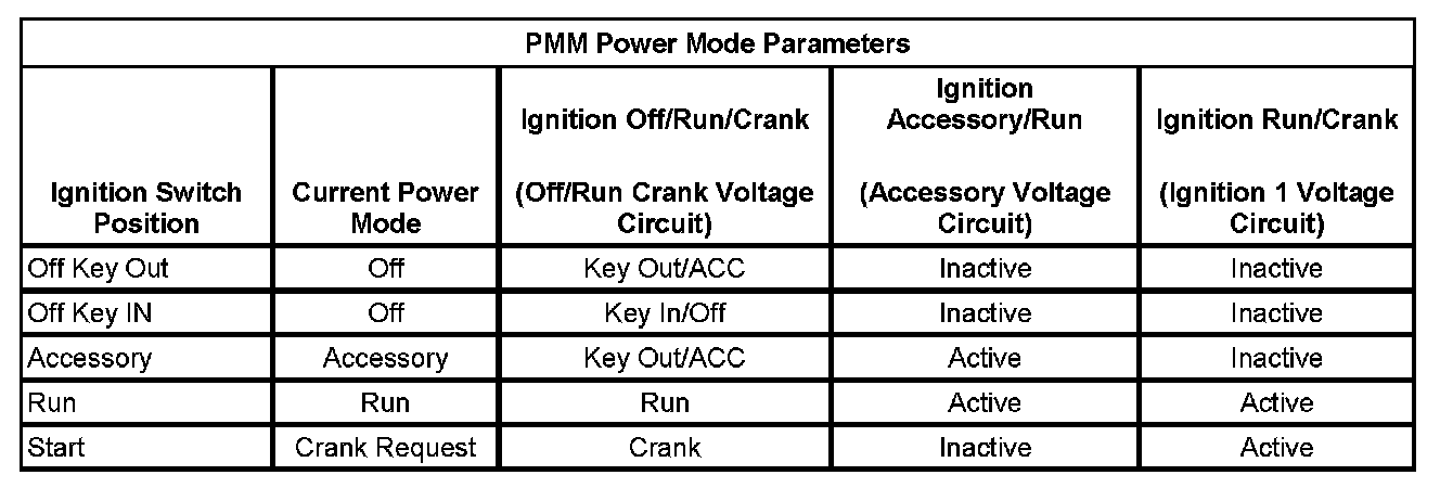 2. With a scan tool, access Body Control Module, Power Mode data display list and compare all parameters listed with the corresponding ignition key position. The PMM Power Mode Parameters table below illustrates the correct state of these input parameters (circuits) in correspondence to the ignition switch position.