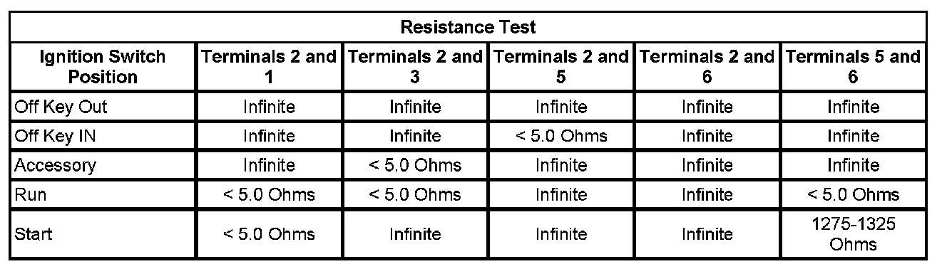 2. Using the Resistance Test table below, check the resistance between the terminals of the ignition switch listed in each switch position.