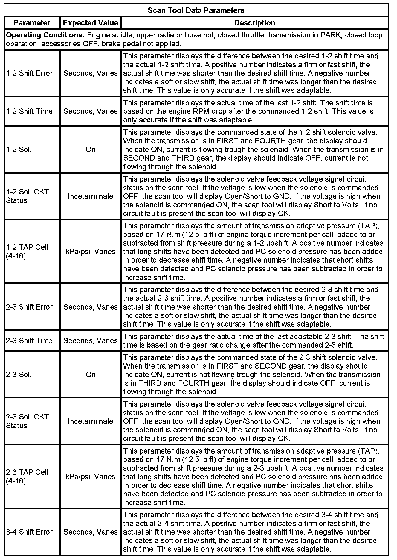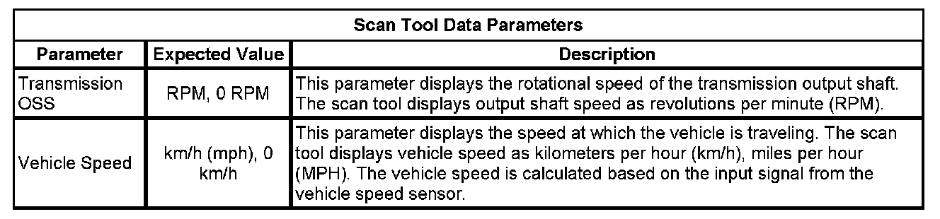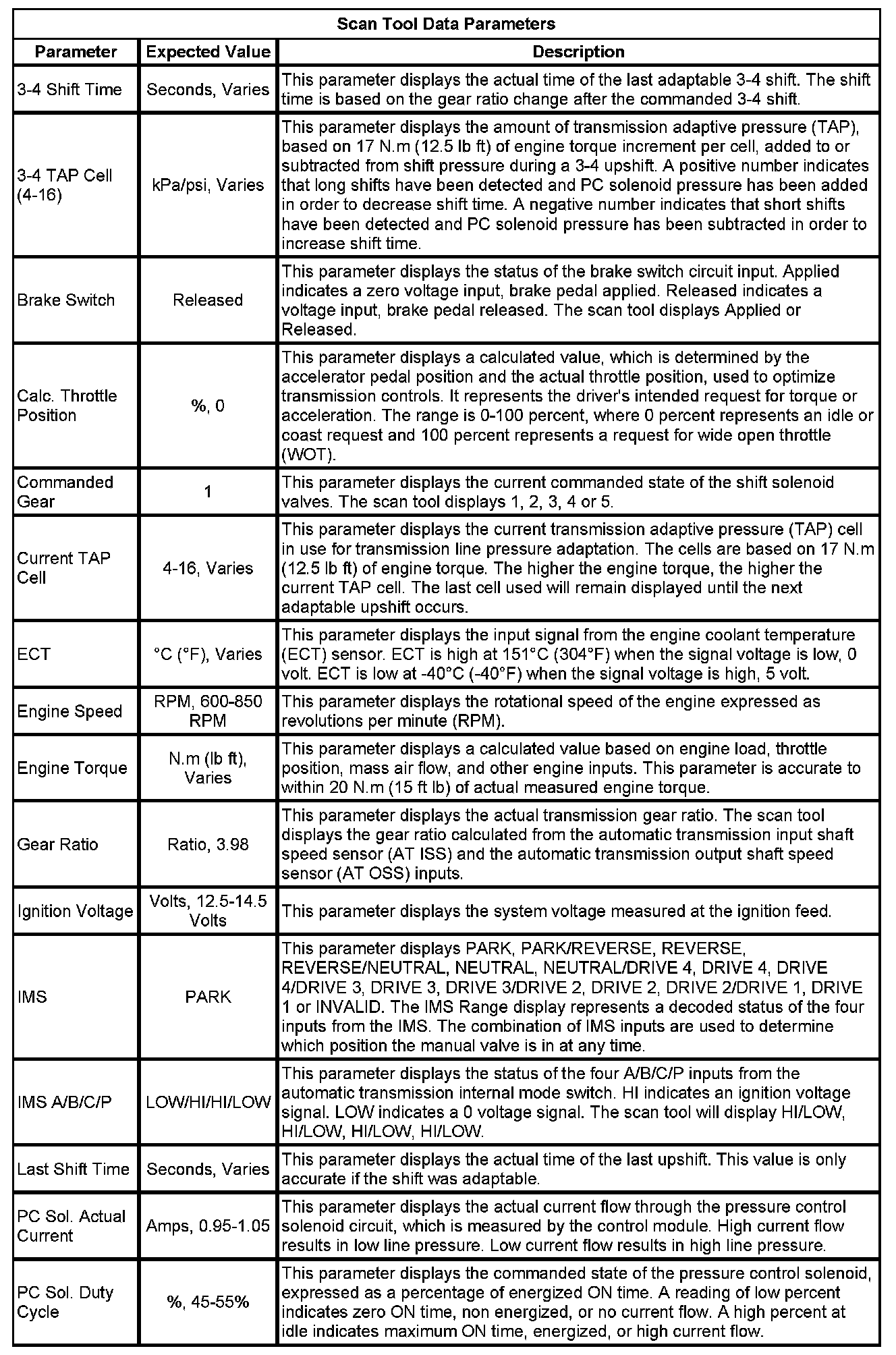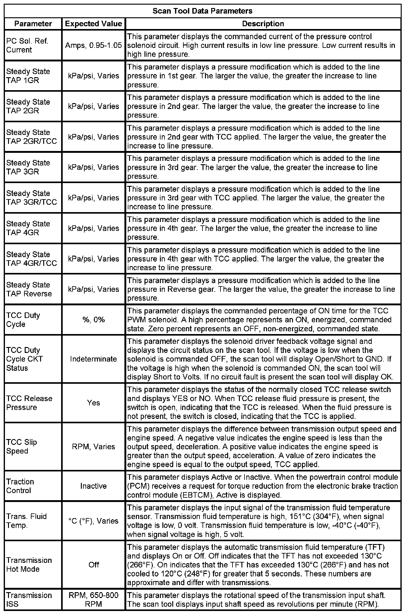 The Transmission Control Module Scan Tool Information contains all transmission related parameters that are available on the scan tool. The list is arranged in alphabetical order. A given parameter may appear in any one of the data lists, and in some cases may appear more than once, or in more than one data list in order to group certain related parameters together.