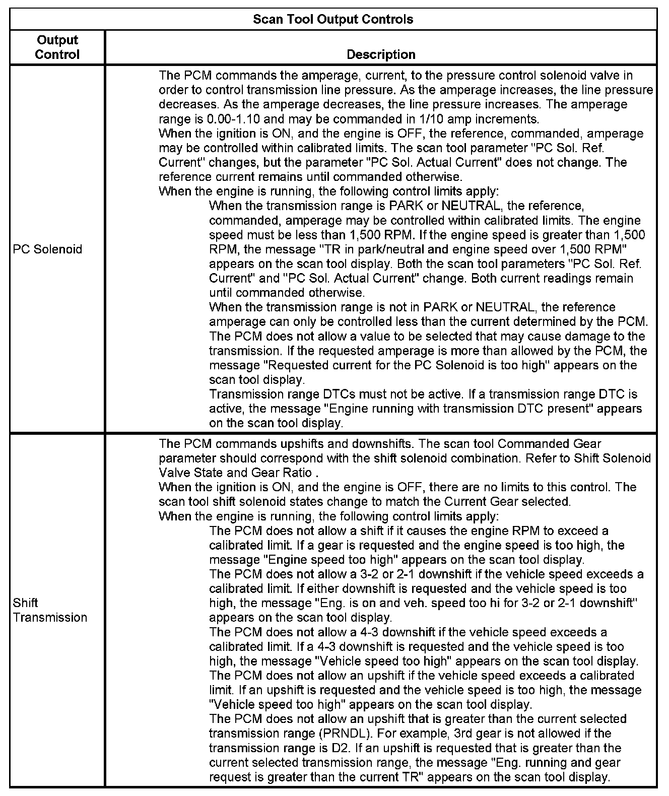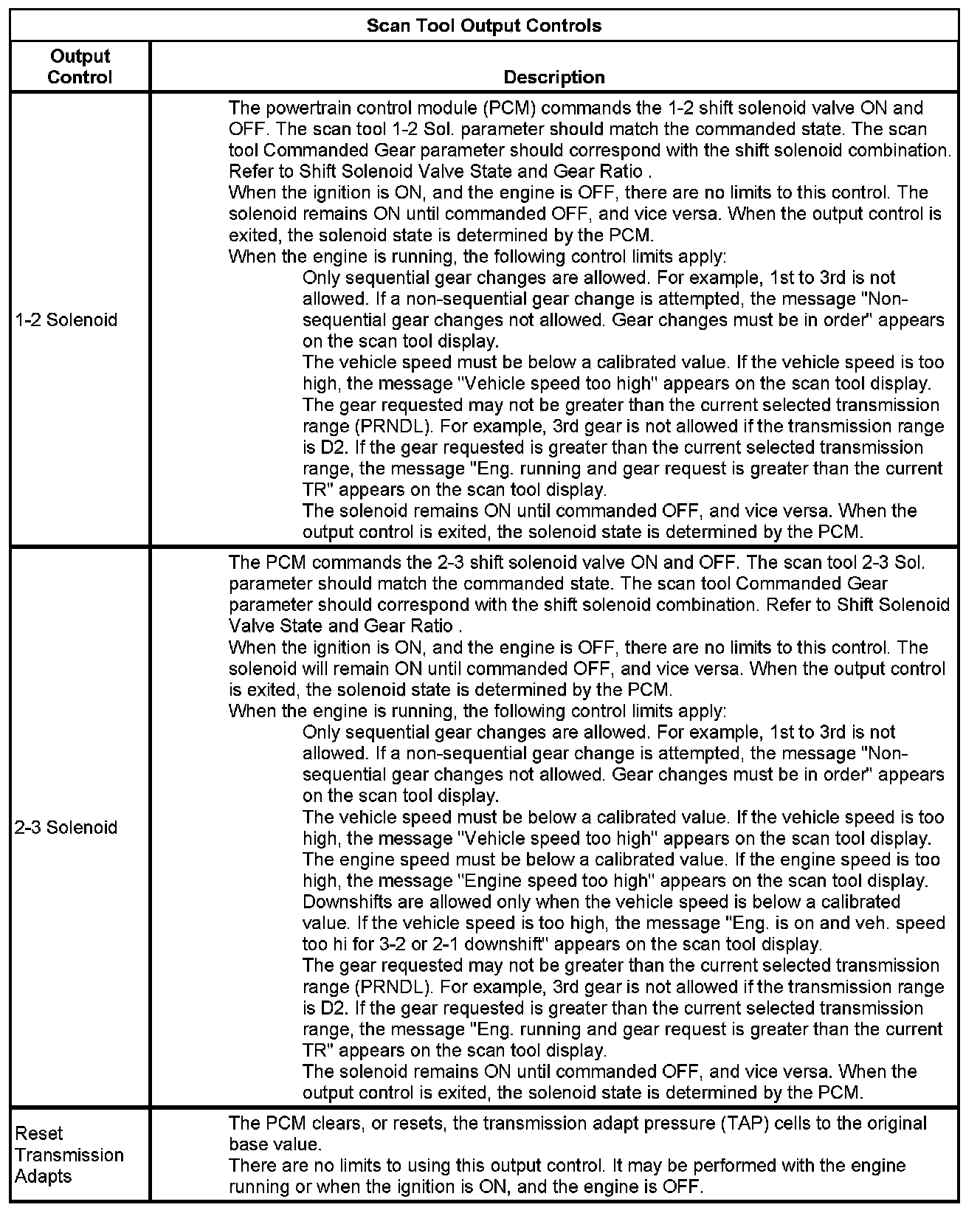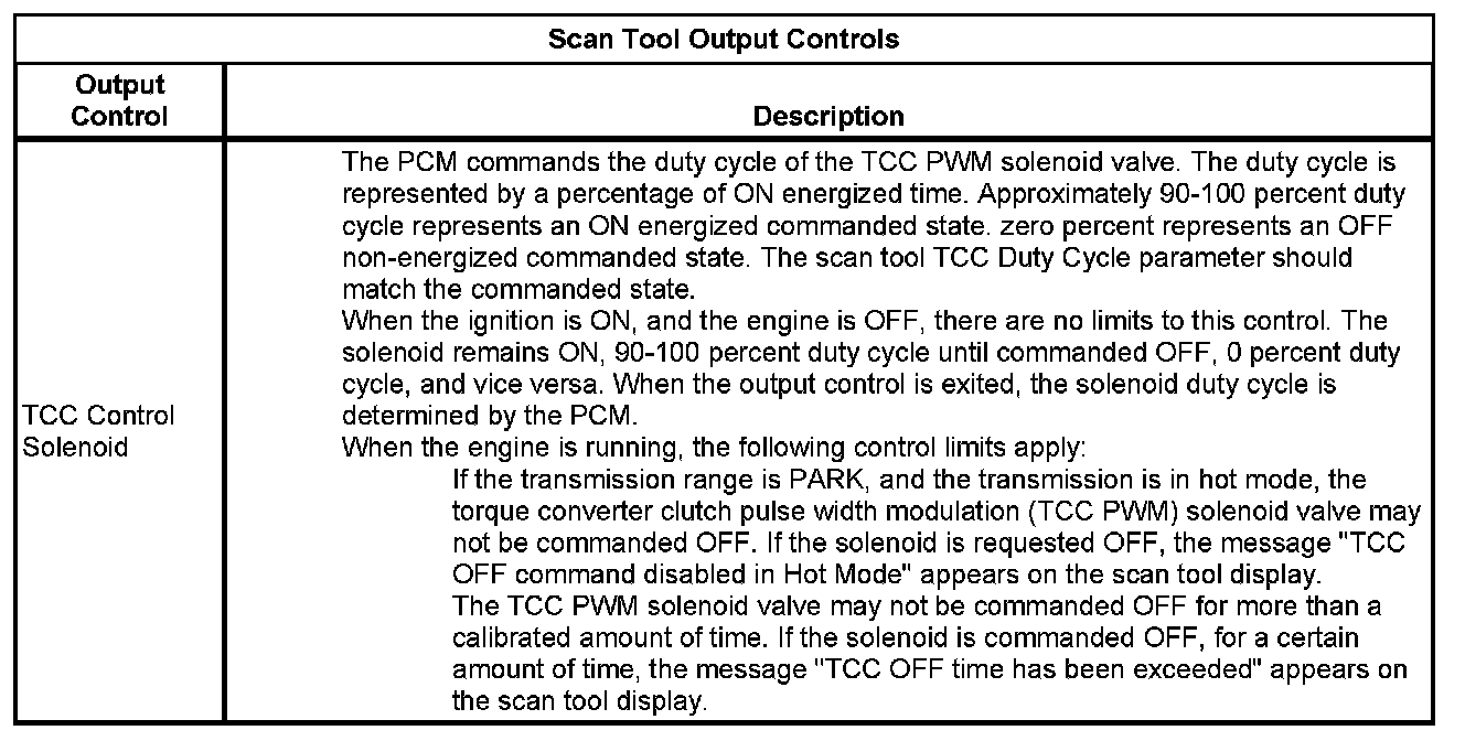 The Transmission Control Module Scan Tool Information contains all transmission related parameters that are available on the scan tool. The list is arranged in alphabetical order. A given parameter may appear in any one of the data lists, and in some cases may appear more than once, or in more than one data list in order to group certain related parameters together.