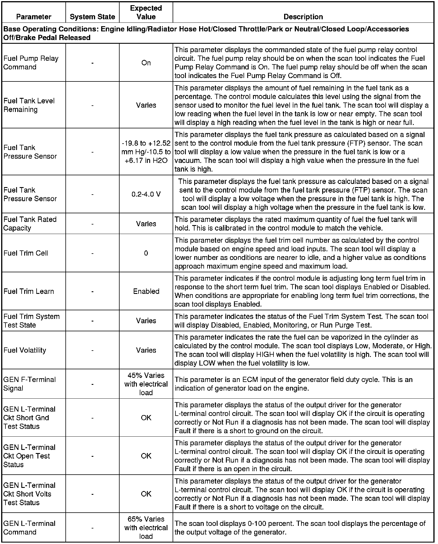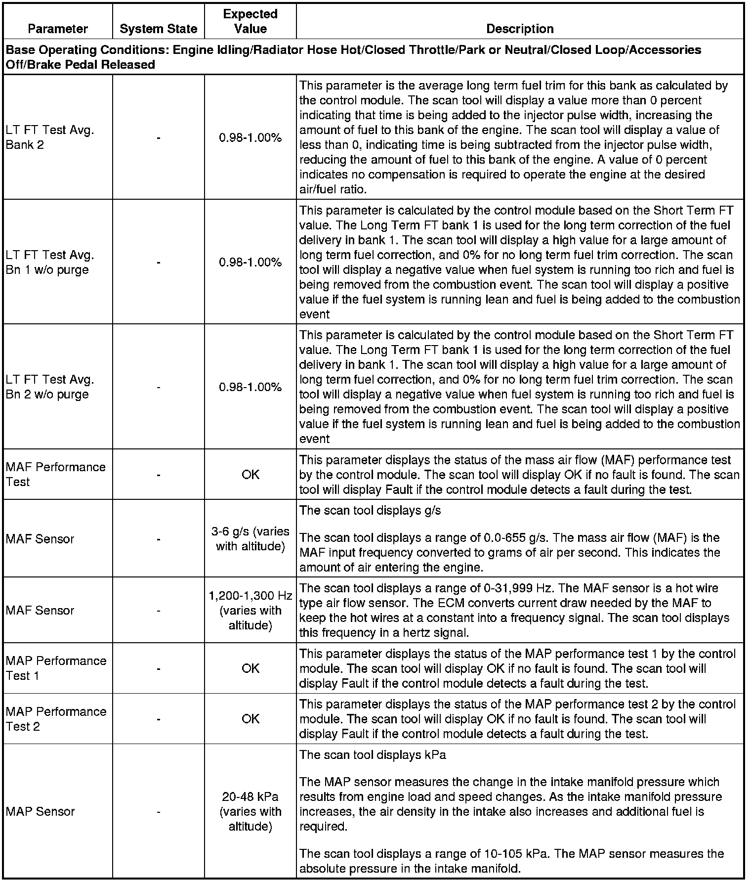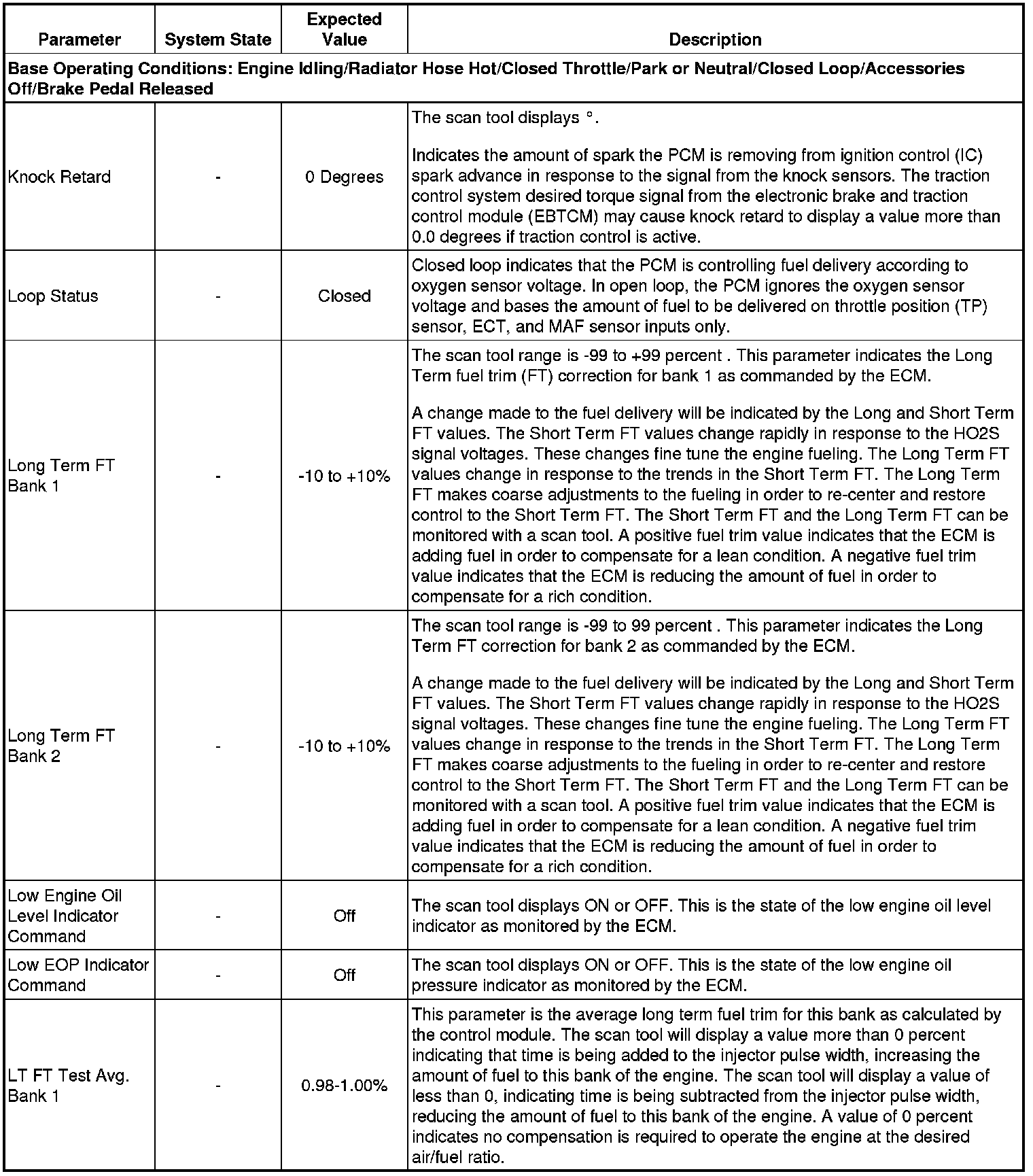 The scan tool values from a properly running engine may be used for comparison with the engine you are diagnosing. The Engine Scan Tool Data List represents values that would be seen on a normally running engine.