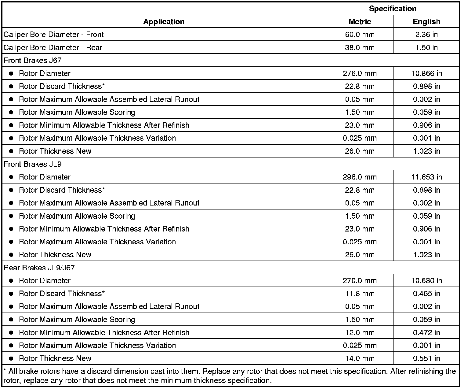 Disc Brake Component Specifications