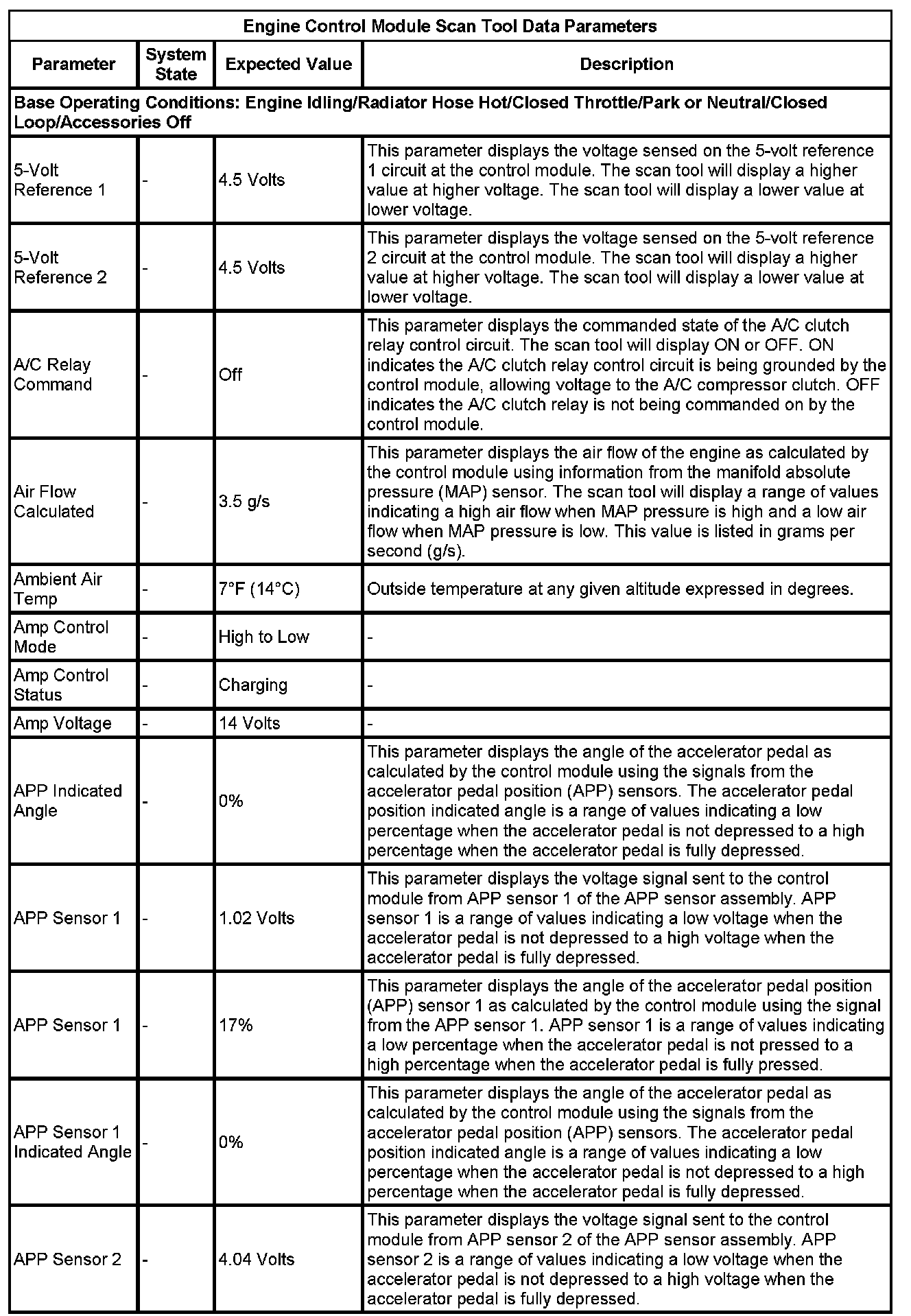 Scan tool values from a properly running engine may be used for comparison with the engine you are diagnosing. The Engine Scan Tool Data List represents values that would be seen on a normal running engine.
