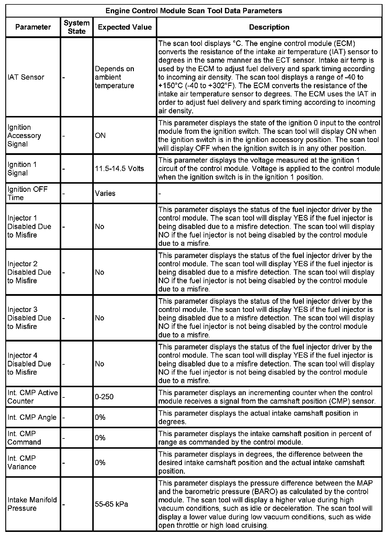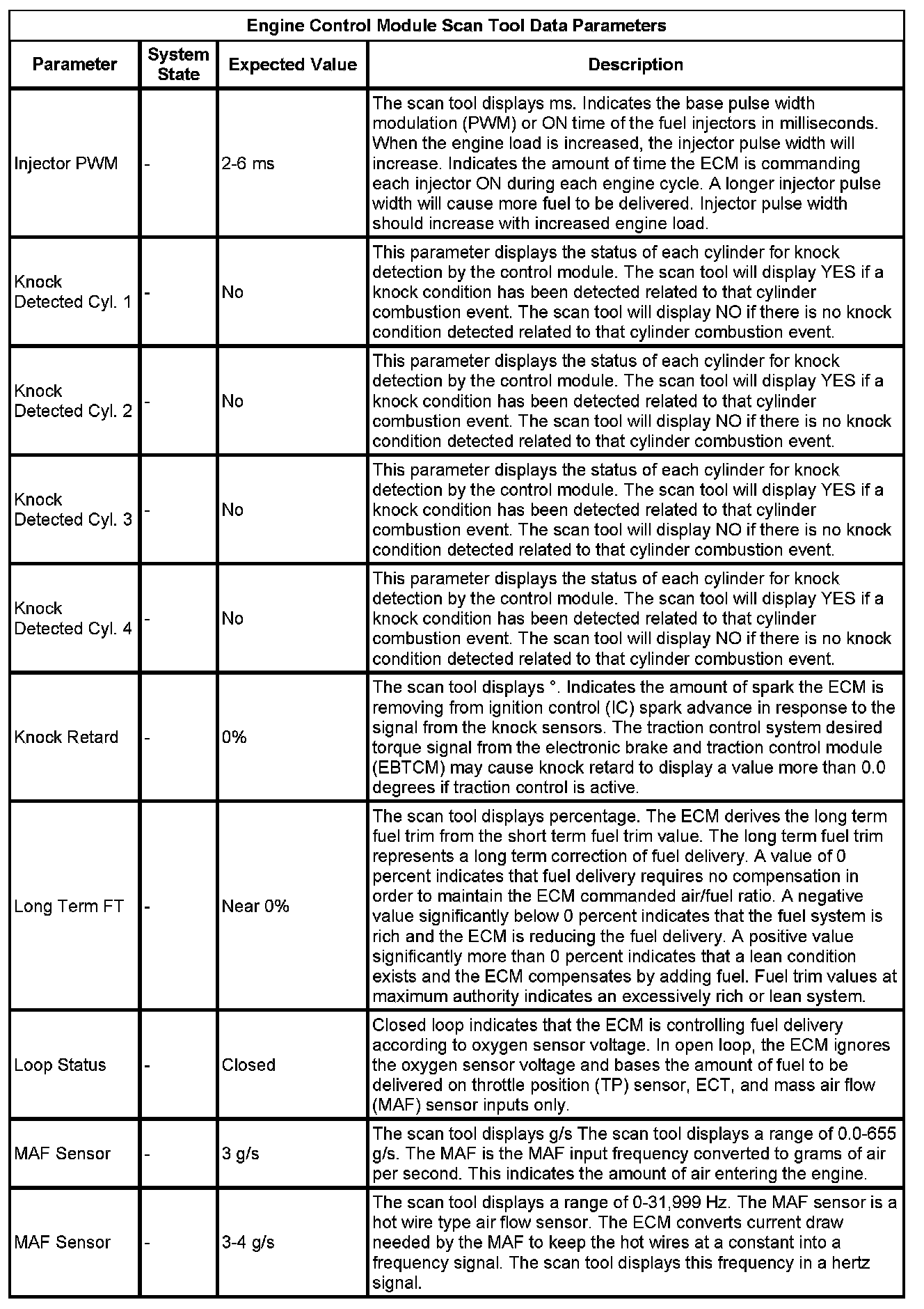 The Engine Scan Tool Data List contains all engine related parameters that are available on the scan tool. The list is arranged in alphabetical order.