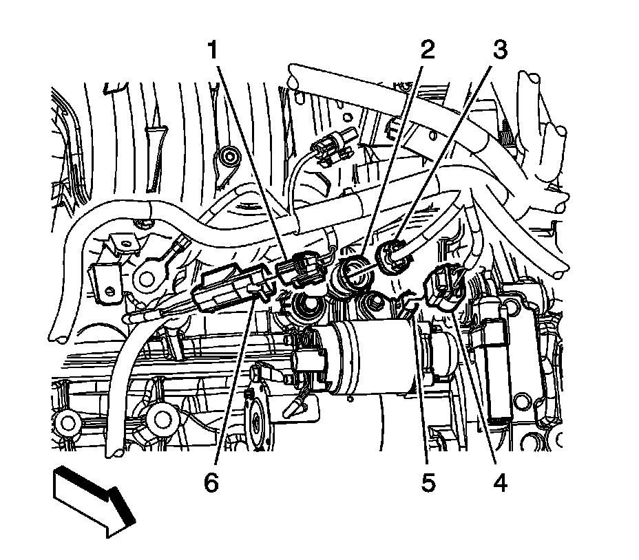 4. Remove the knock sensor electrical connector pigtail (6) clip from the oil level indicator tube bracket.
