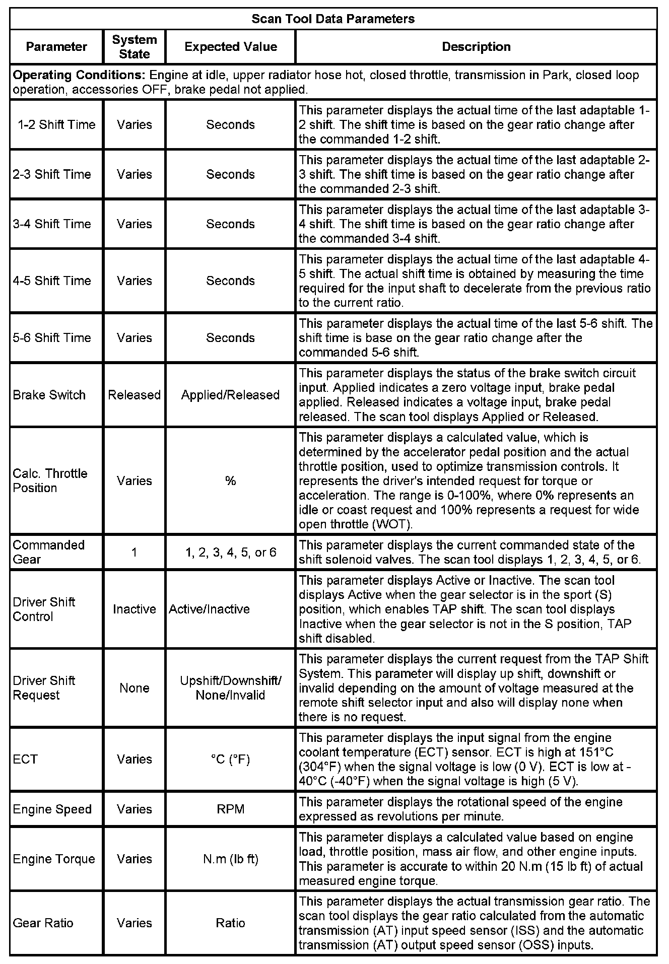 The Transmission Control Module Scan Tool Data List contains all transmission related parameters that are available on the scan tool. The list is arranged in alphabetical order. A given parameter may appear in any one of the data lists, and in some cases may appear more than once, or in more than one data list in order to group certain related parameters together.