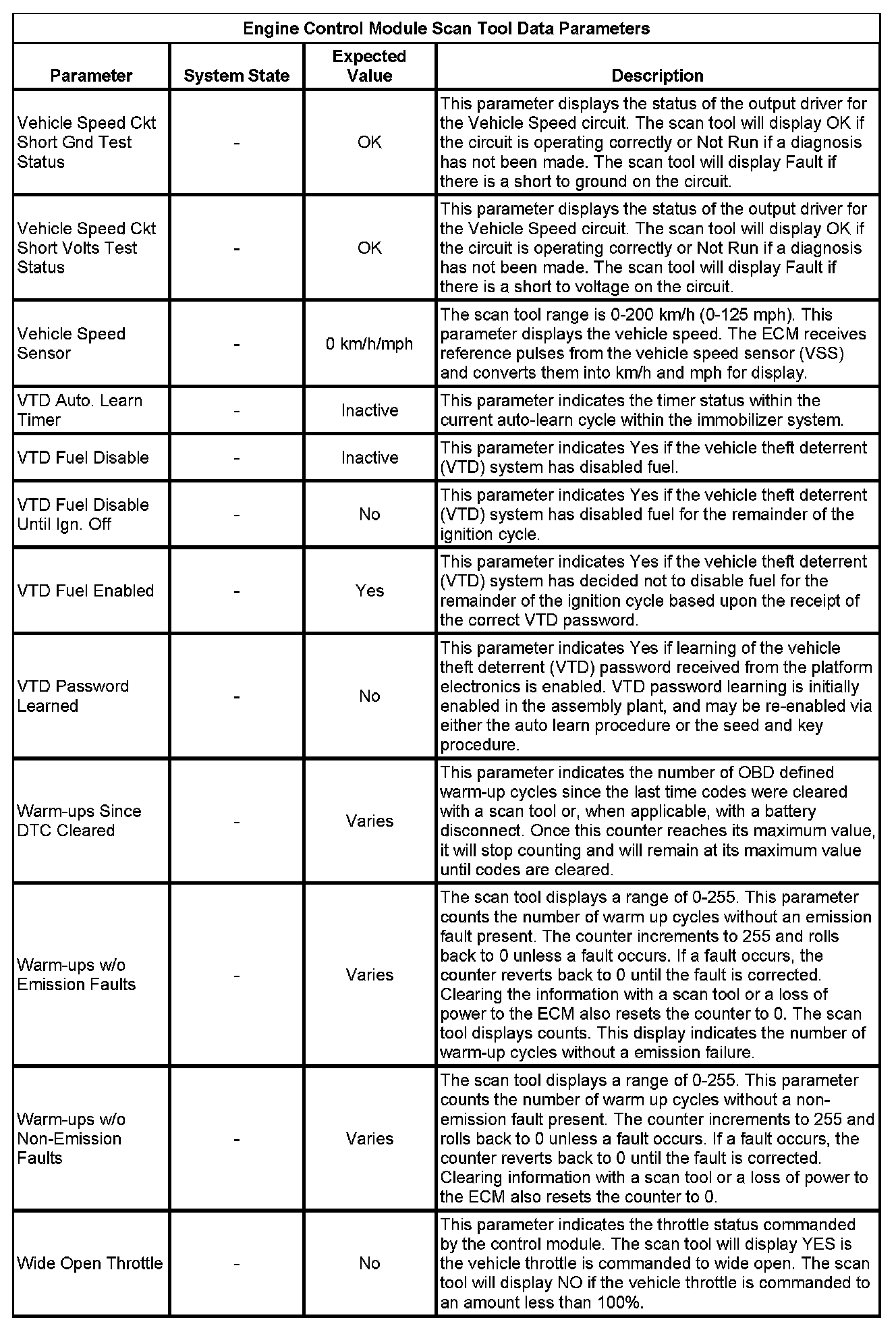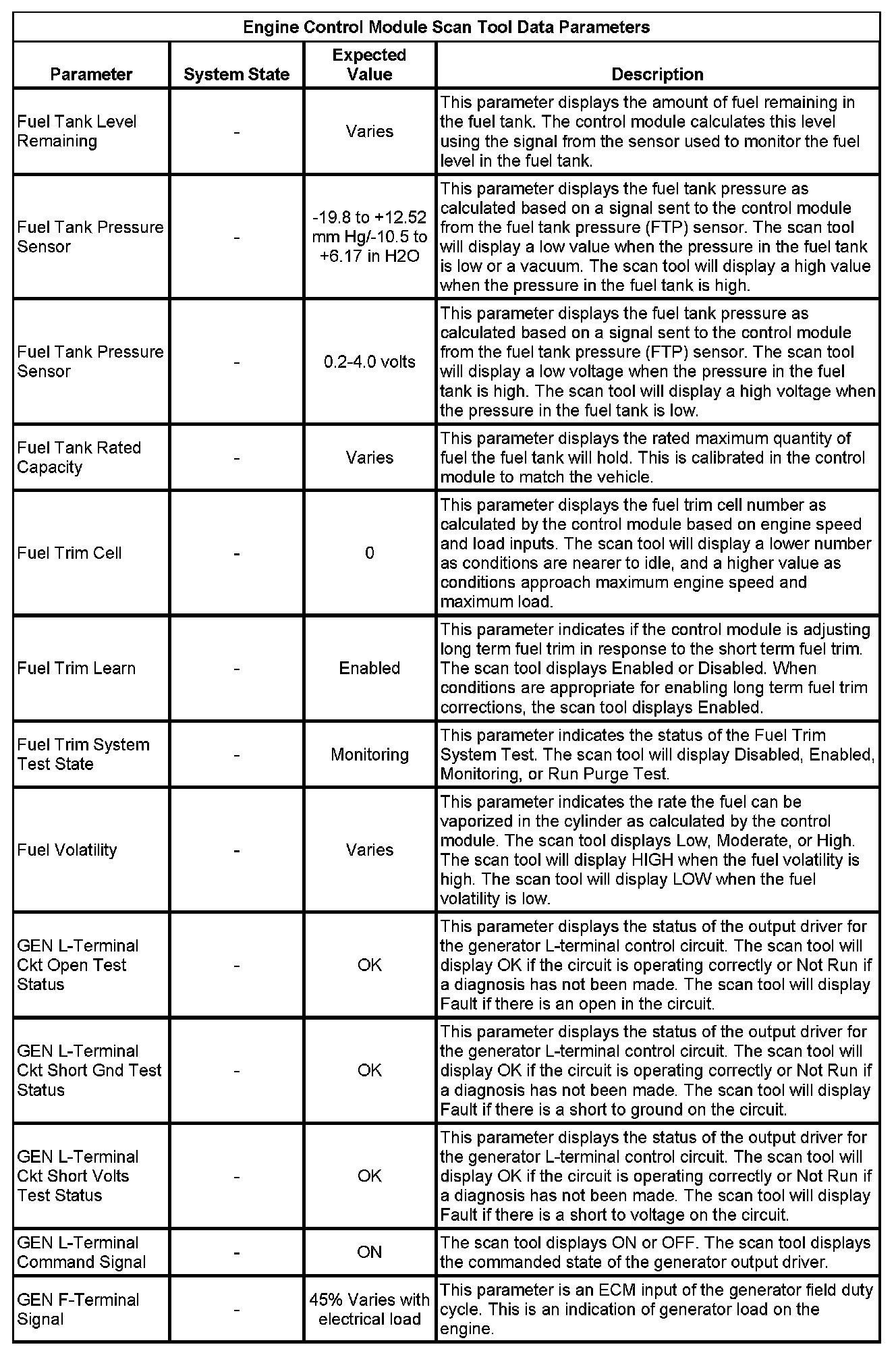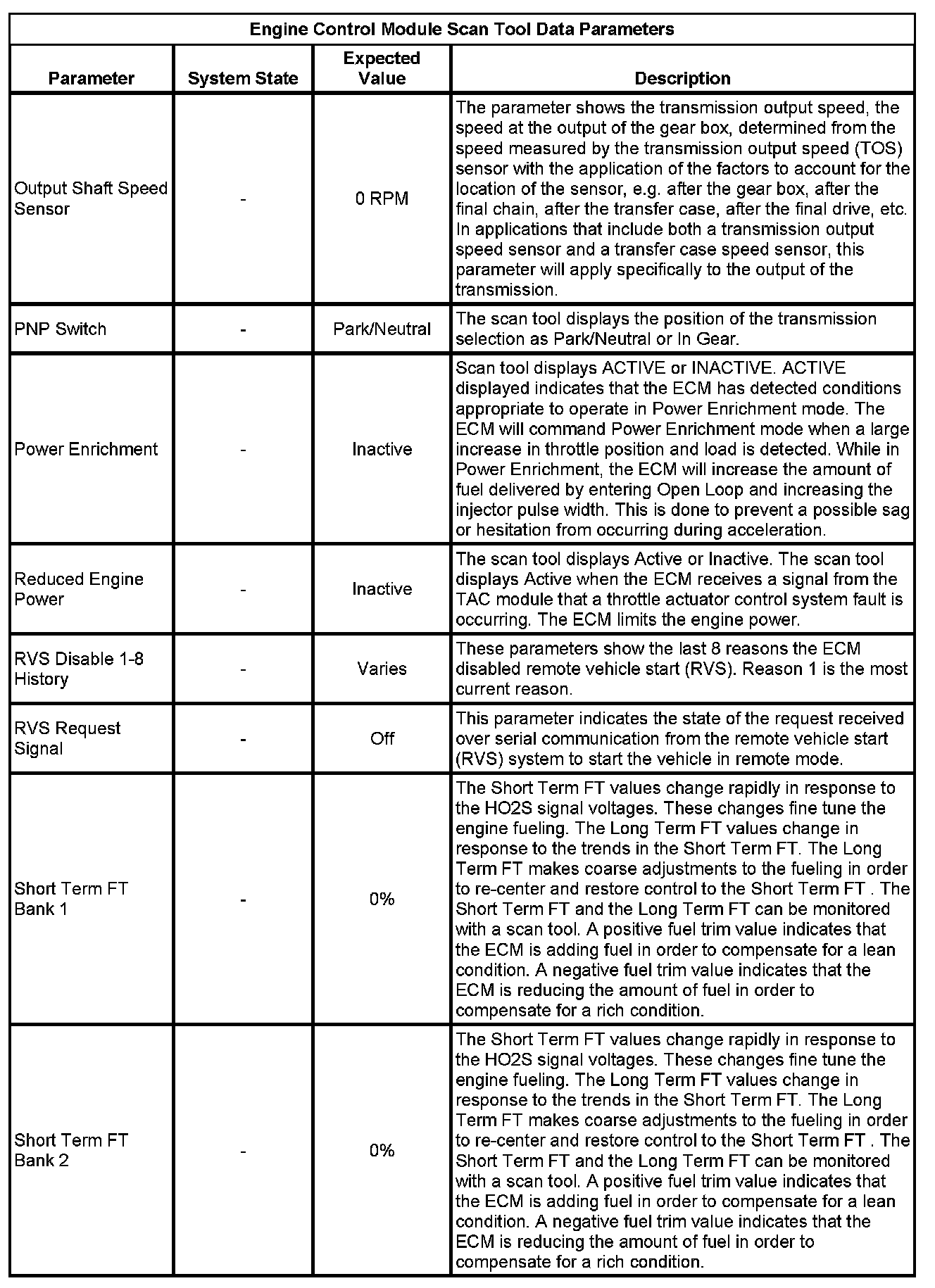 The Engine Control Module Scan Tool Data List contains all engine-related parameters that are available on the scan tool. The list is arranged in alphabetical order. A given parameter may appear in any one of the data lists, and in some cases may appear more than once, or in more than one data list in order to group certain related parameters together.