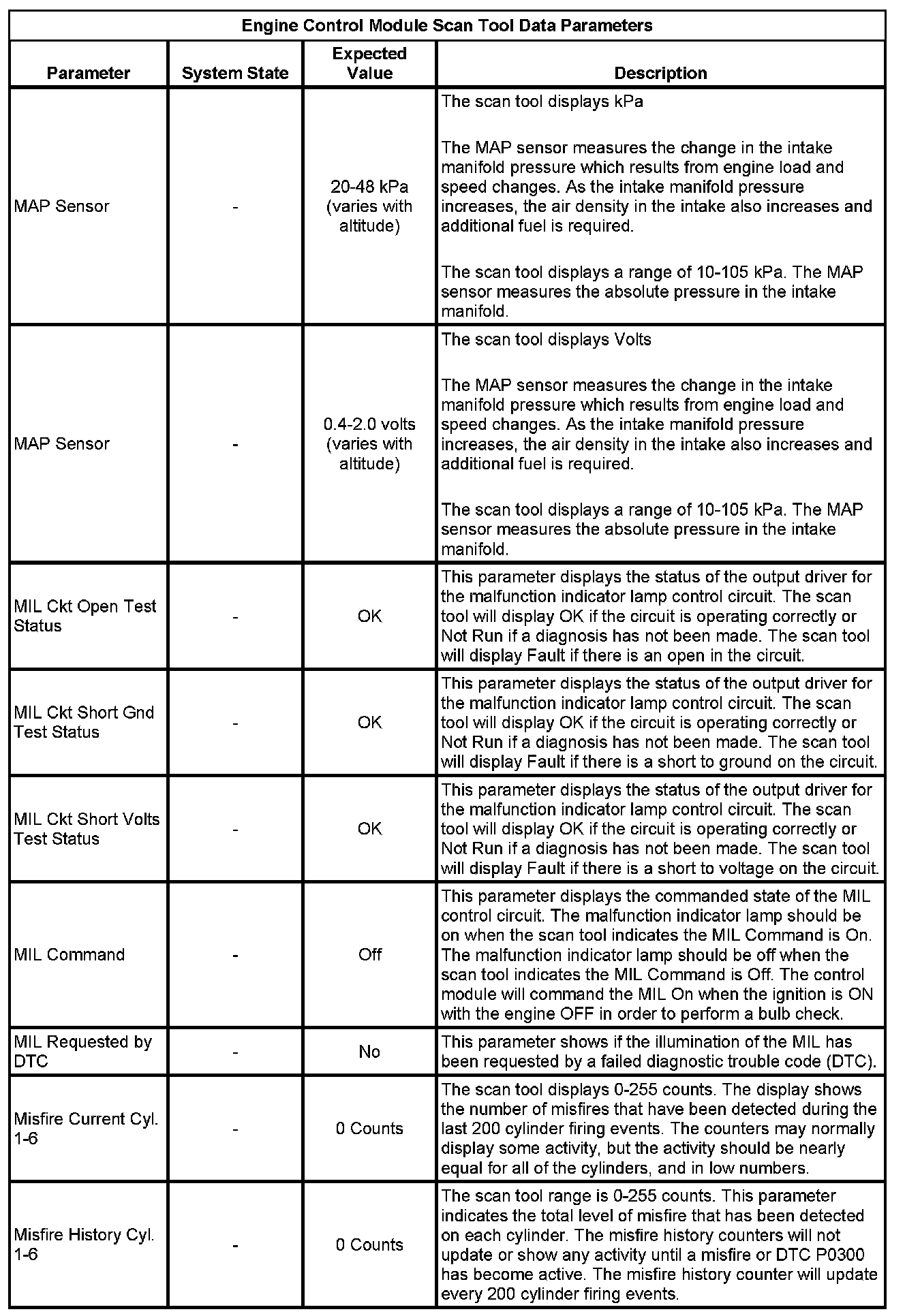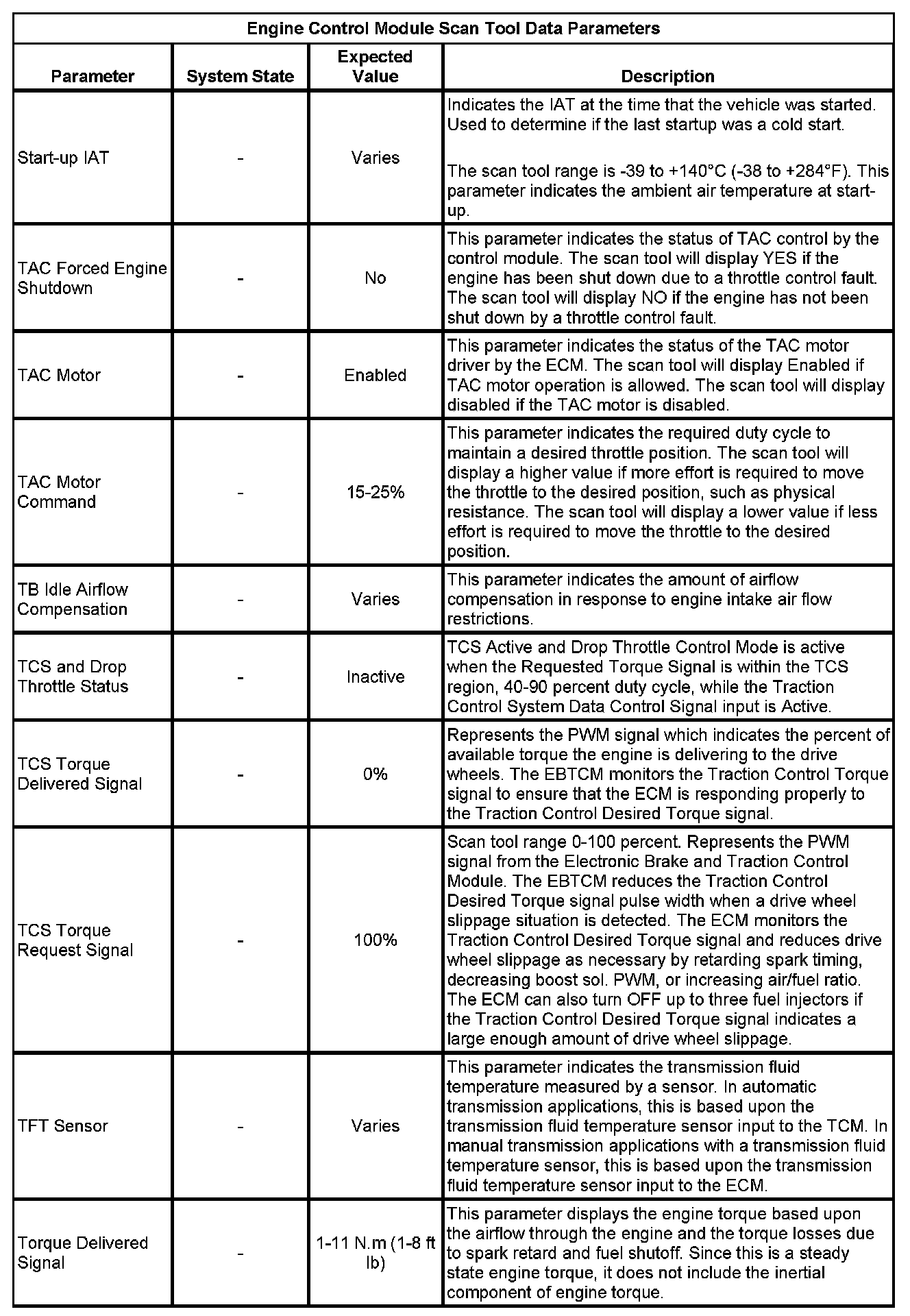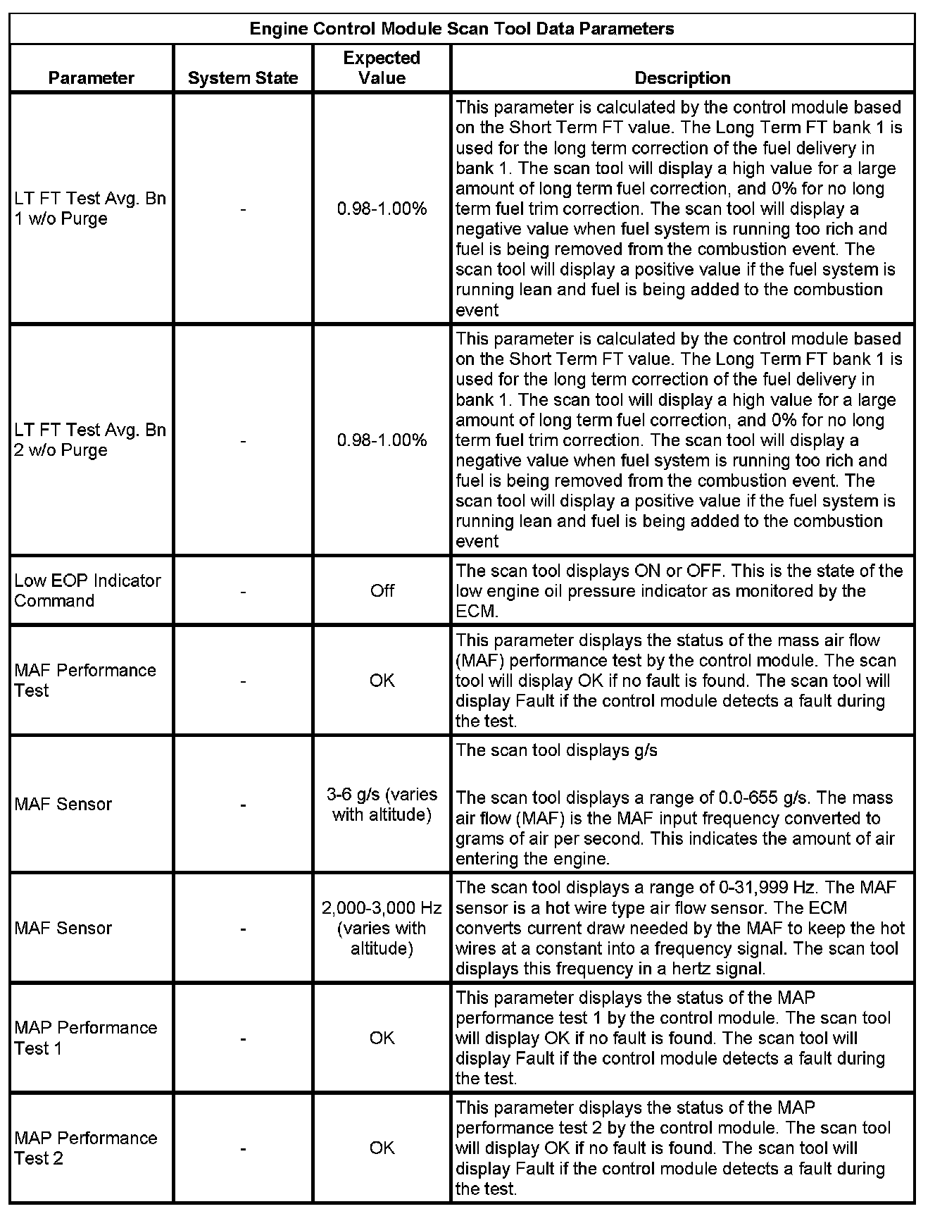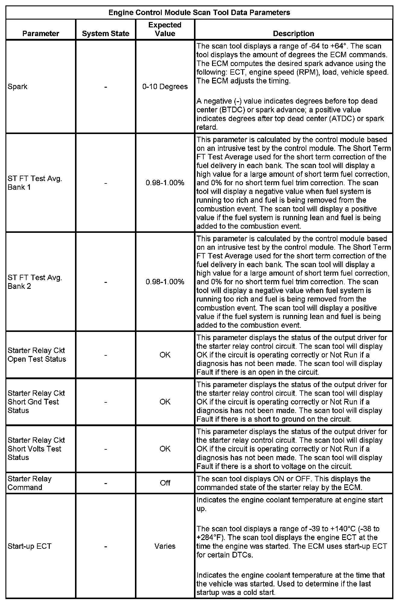 The Engine Control Module Scan Tool Data List contains all engine-related parameters that are available on the scan tool. The list is arranged in alphabetical order. A given parameter may appear in any one of the data lists, and in some cases may appear more than once, or in more than one data list in order to group certain related parameters together.