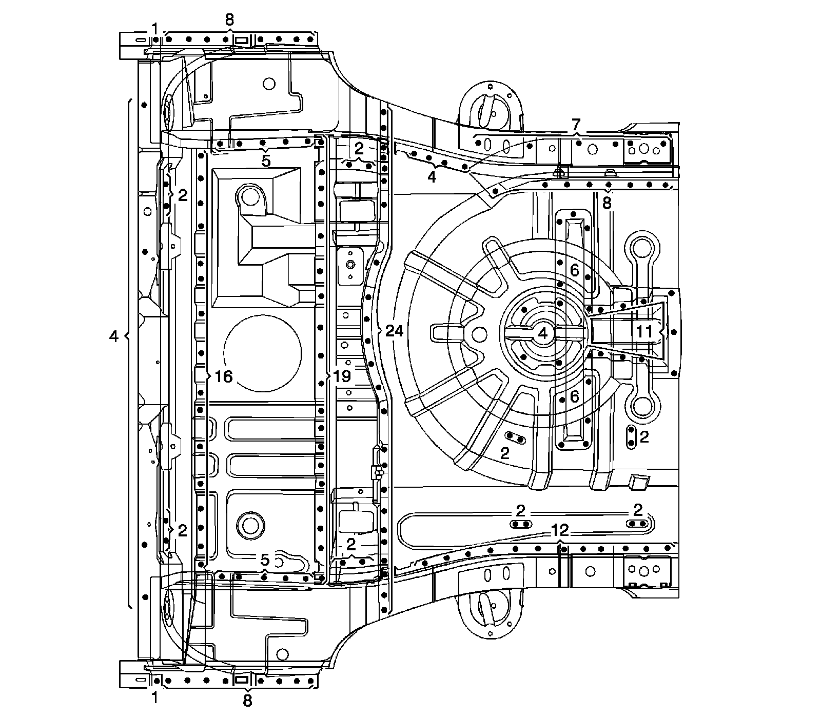 The rear floor panel is the base of the rear body and it is critical for the rigidity of the rear body. During replacement, refer to Dimensions - Body to determine the position to set the rear floor properly.