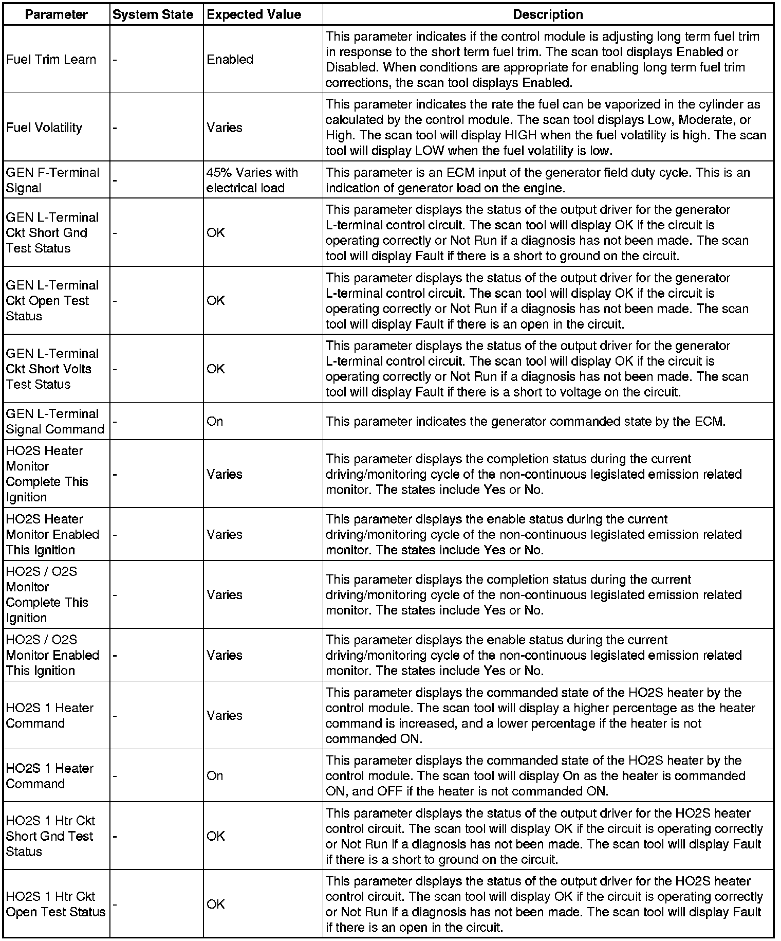 Only the parameters listed below are referenced in this service manual for use in diagnosis. If all values are within the typical range described below, refer to Symptoms - Engine Controls (- Symptoms - Engine Controls) for the 2.0L engine for diagnosis.