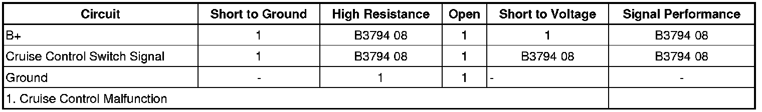 Ignition ON, observe the cruise control indicator while applying the cruise ON/OFF switch. The indicator should turn ON and OFF accordingly with the applied switch.