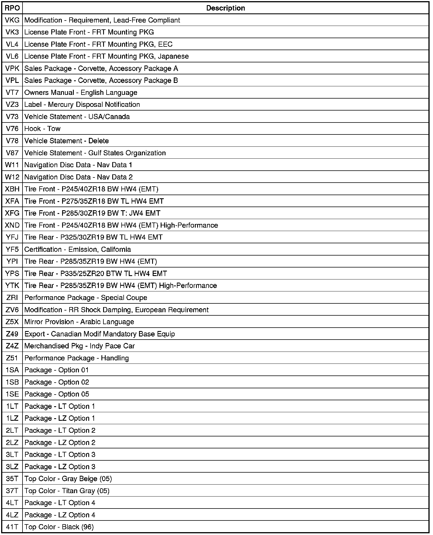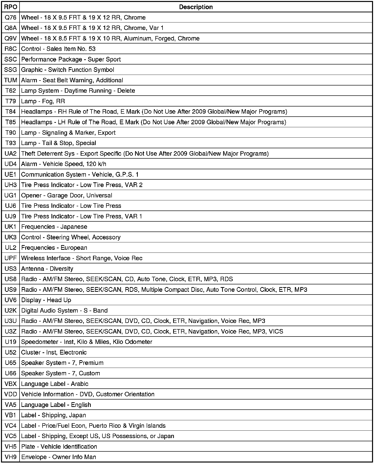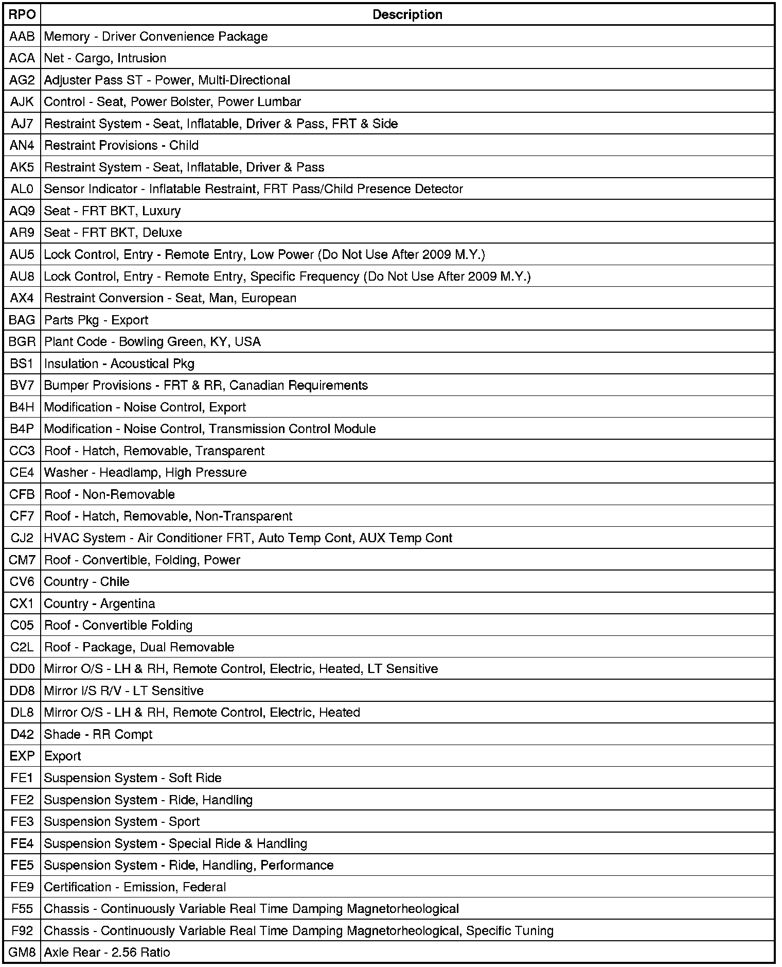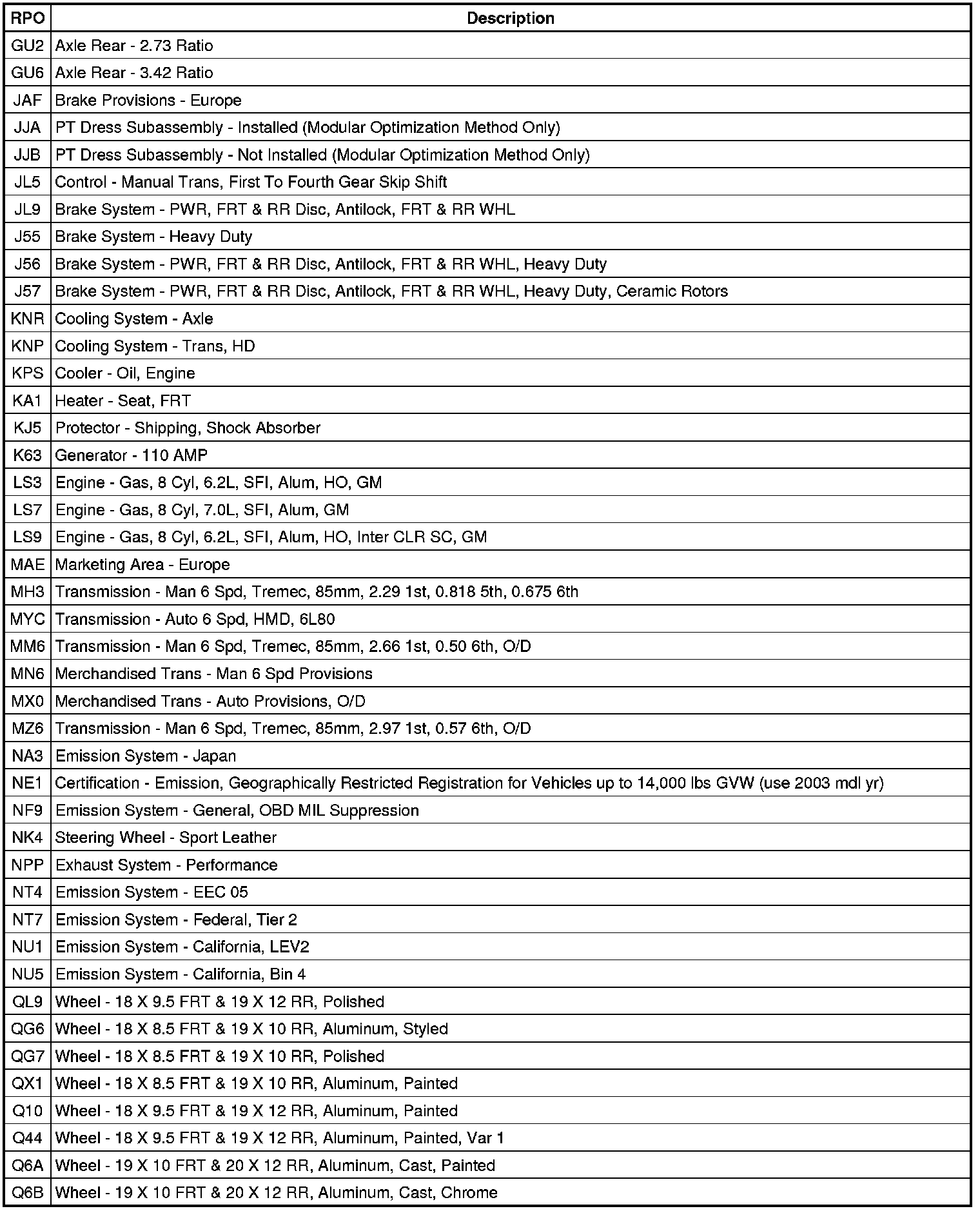 The following table provides the description of the Regular Production Option (RPO) codes that are available on the vehicle. The vehicle's RPO list is printed on the Service Parts Identification Label.