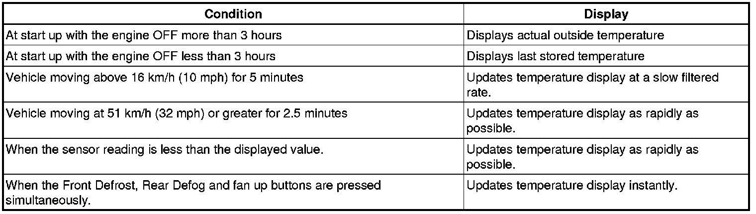 The radio displays the outside air temperature value that it receives from the HVAC control module through a class 2 message. The scan tool has the ability to update the displayed ambient air temperature. The outside air temperature value is displayed or updated under the following conditions:
