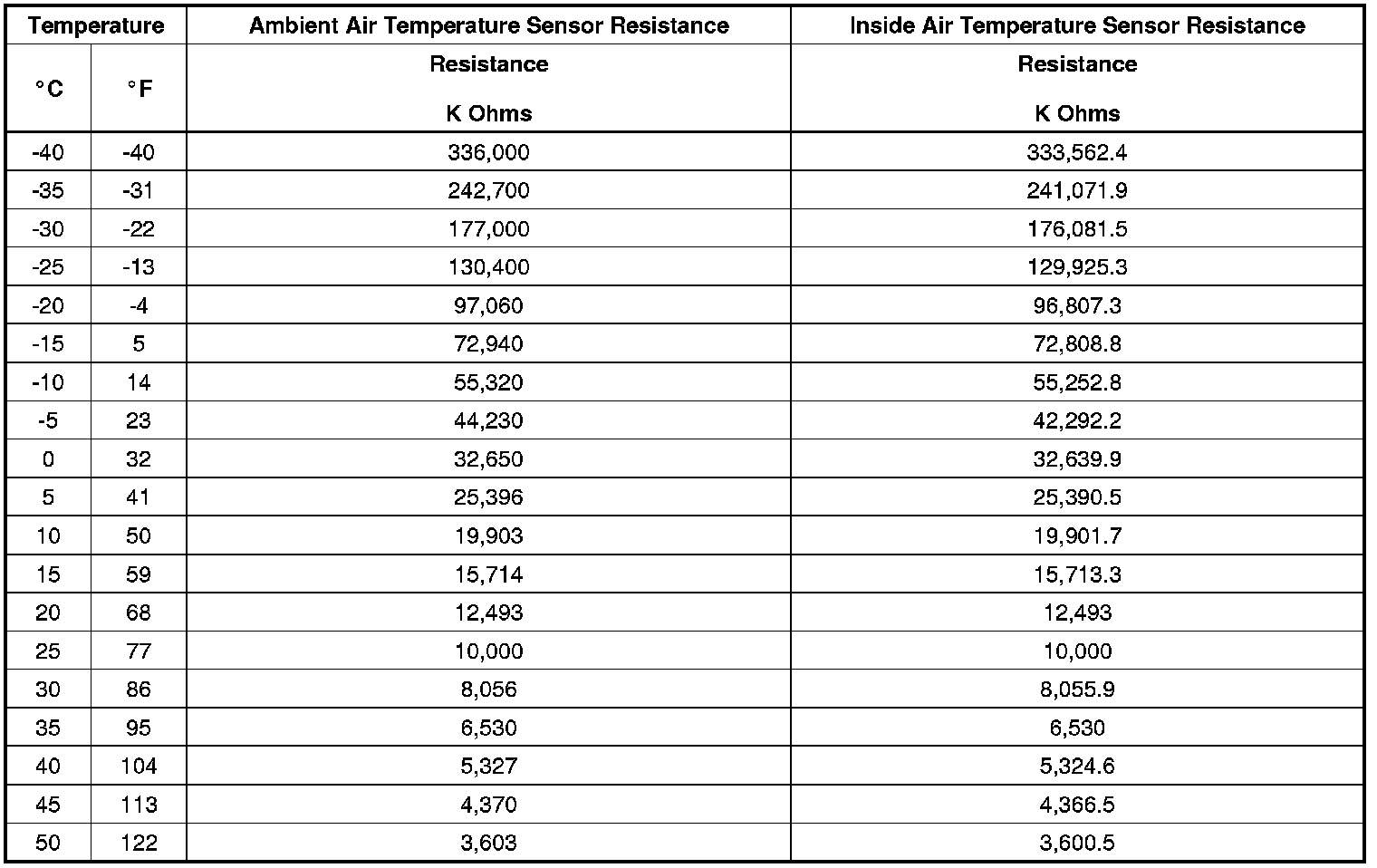 Sensor Resistance Table (Inside and Ambient Air Temp Sensor)