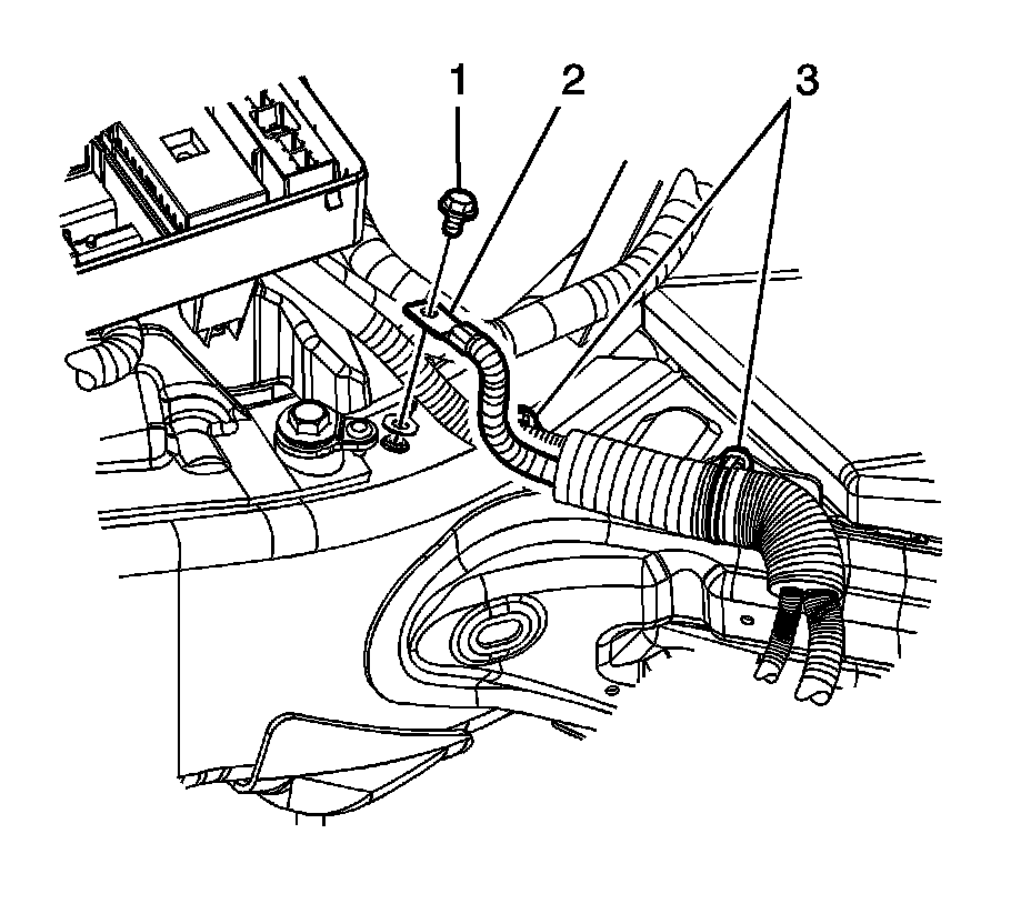 5. Install the battery positive/negative cable bolt (1) and attach the wiring harness retainers (3) and tighten to 25 Nm (18 lb ft).