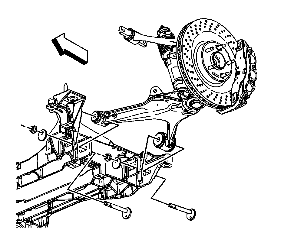 Caution:The magnesium crossmember requires the use of unique lower control arm cam bolts, washers, and aluminum bushing ferrules. Failure to use these specific components during assembly will result in severe corrosion damage.