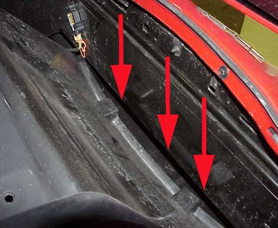 This is a picture of a upper radiator air baffle with a good fit (2) but the bumper beam holes (1) need to be covered with a good adhesive type patch (sound deadener patch) or equivalent. Sound deadener patches can be obtained from Kent Automotive*. Contact Kent Automotive at 1-888-YES-KENT (www.kent-automotive.com) to obtain Kent P/N P20617.