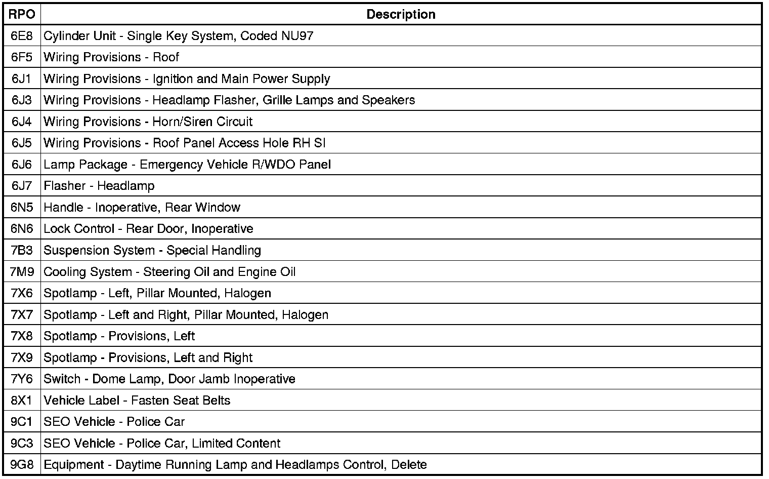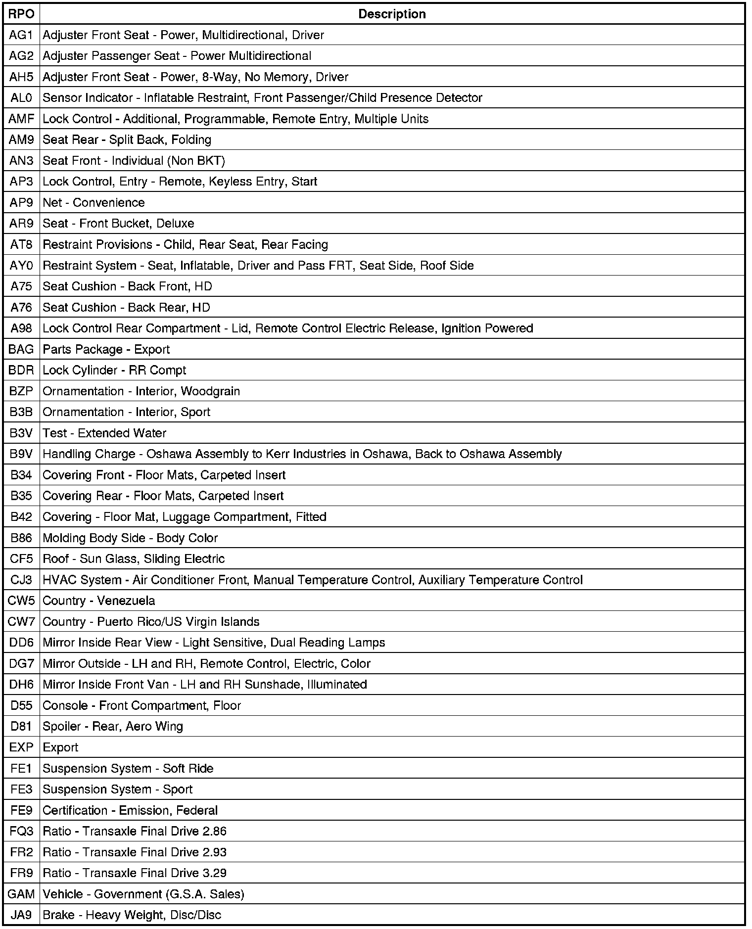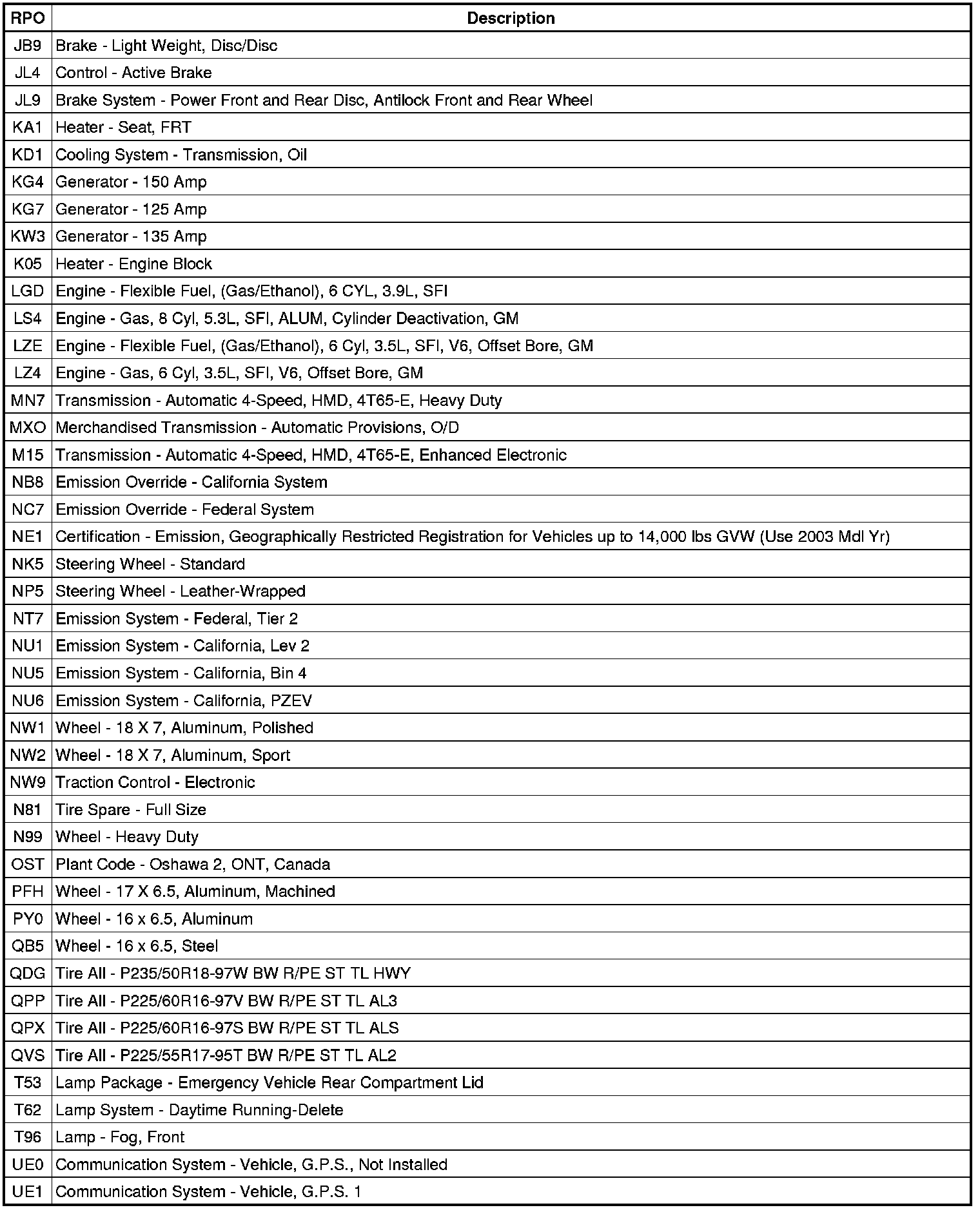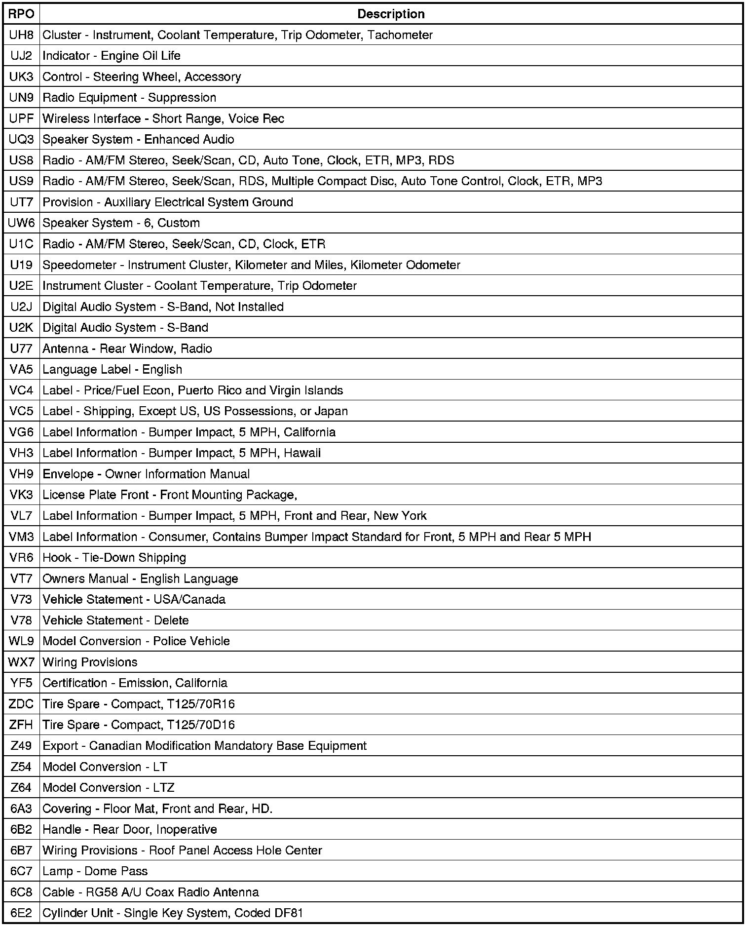 The following table provides the description of the Regular Production Option (RPO) codes that are available on the vehicle. The vehicle's RPO list is printed on the Service Parts Identification Label.