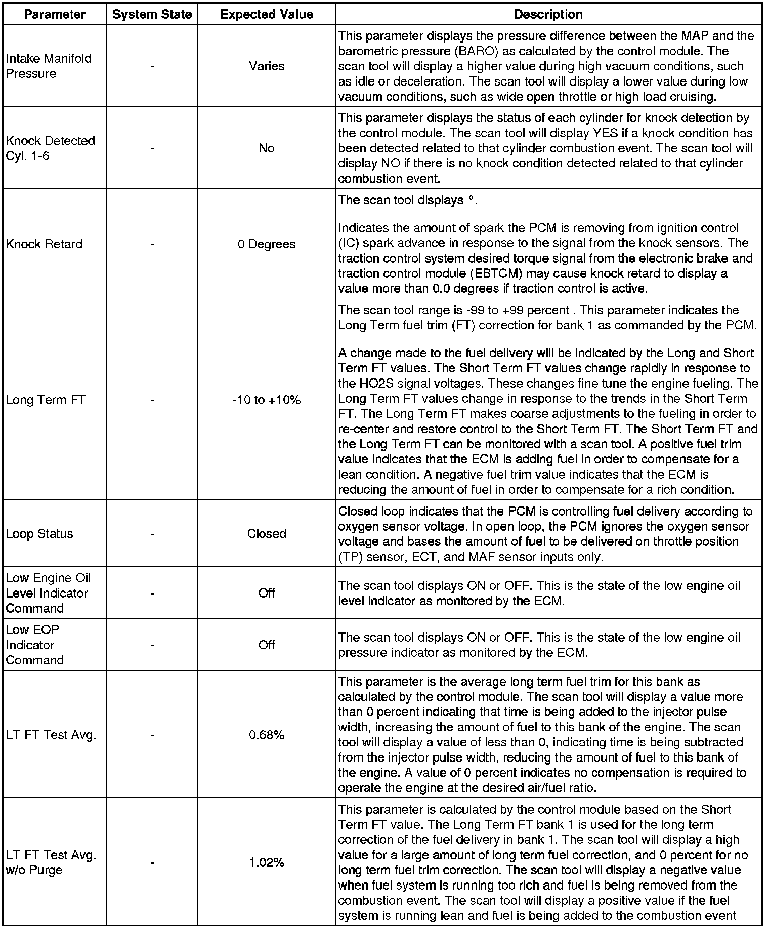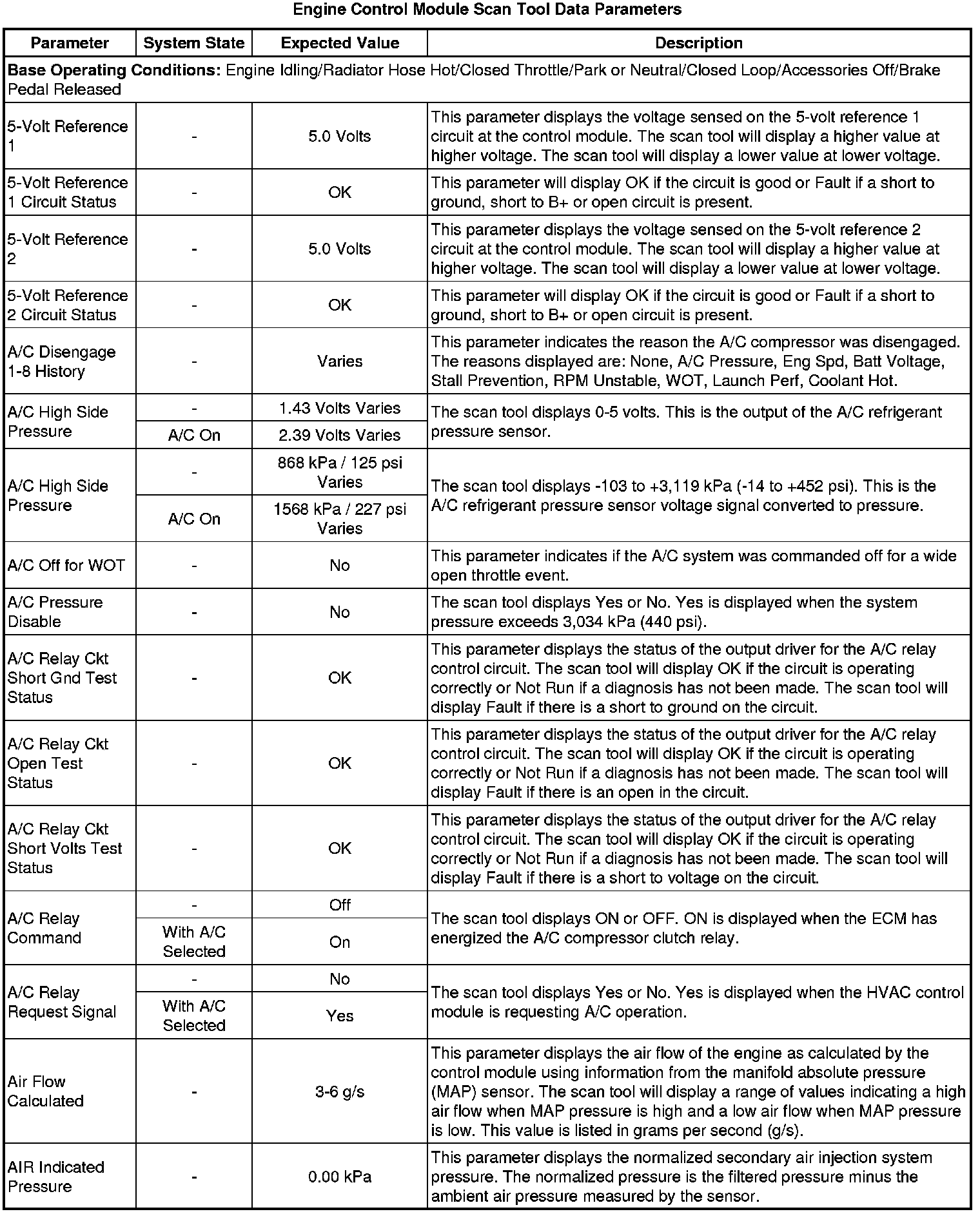 The Engine Control Module Scan Tool Data List contains all engine-related parameters that are available on the scan tool. The list is arranged in alphabetical order. A given parameter may appear in any one of the data lists, and in some cases may appear more than once, or in more than one data list in order to group certain related parameters together.