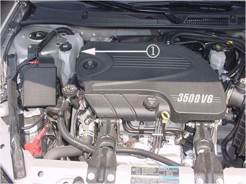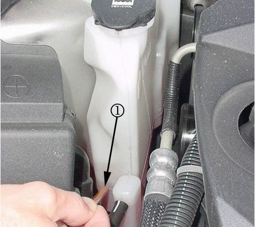 1. Locate the coolant reservoir bottle in the RH rear of the engine compartment (1).