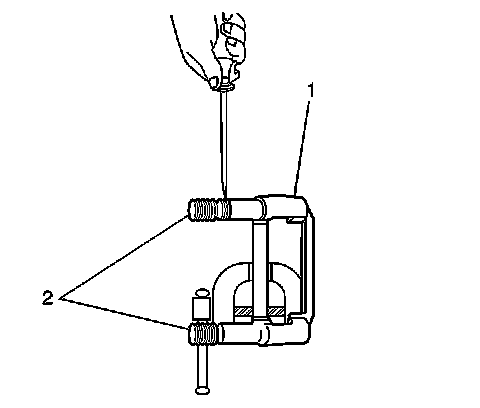 1. Remove the brake caliper from the mounting bracket and support the brake caliper (2) with heavy mechanic's wire (1), or equivalent. Discard the old caliper pin bolts, new bolts are supplied in the hardware kit. It is not necessary to disconnect the hydraulic brake flexible hose from the caliper. Refer to Front Brake Caliper Replacement (Front Brake Caliper Replacement).