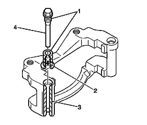 1. Lubricate the bores (3), the inside part of the bolt boot (2) and the caliper pin bolts (4) with GM P/N 18047666, or equivalent.
