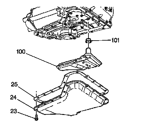 3. Install the gasket (25) and the oil pan (24). Refer to Oil Pan Replacement (Service and Repair).