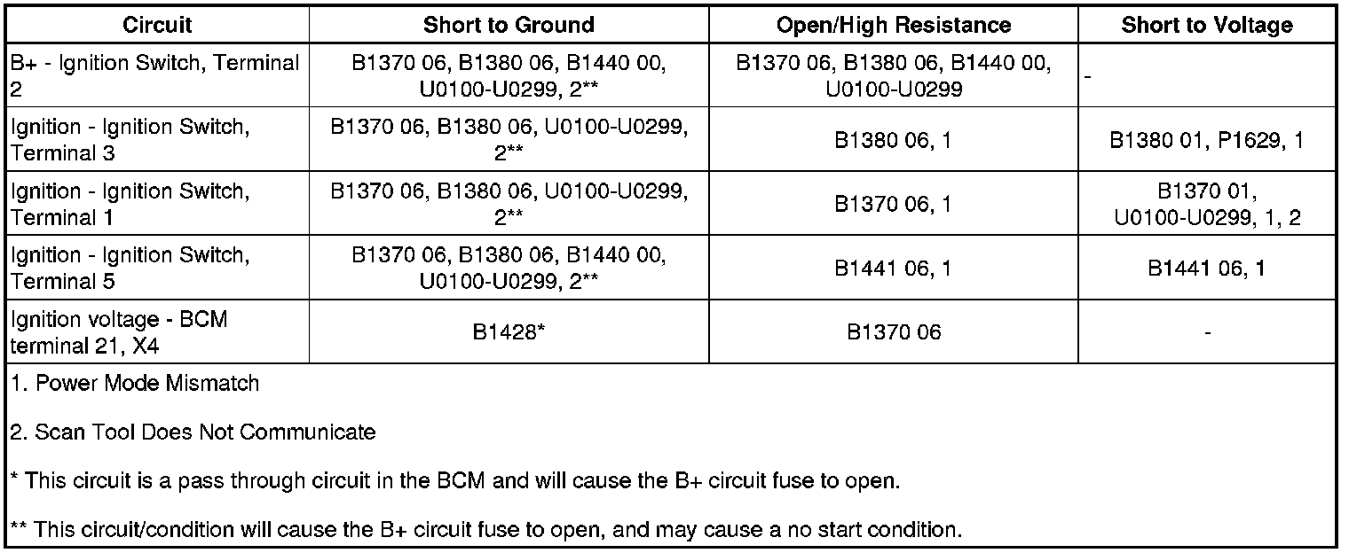 BCM senses an open on the B+ circuit to the ignition switch while the engine is running. An open on the B+ circuit can be caused by a short to ground on any of the circuits listed below: