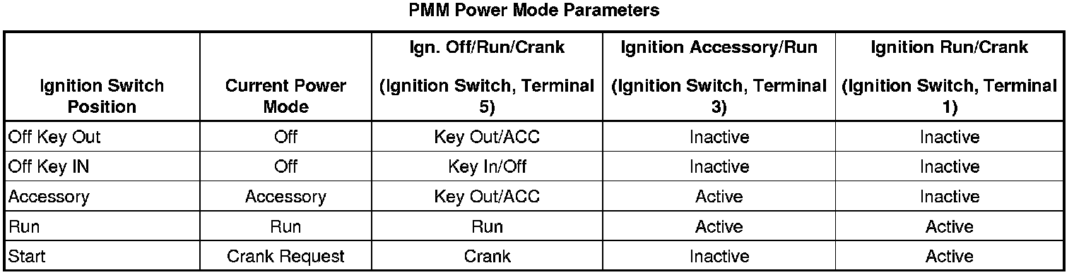 The vehicle power mode master (PMM) is the body control module (BCM). The ignition switch is a low current switch with multiple discrete ignition switch signals to the PMM for determination of the power mode. The PMM receives the ignition switch signals, and additionally a reference voltage signal from the BCM, through the ignition switch, and back to the BCM. There are redundancies within the PMM system that can allow operation of certain subsystems when there are faults in the ignition switch circuits. Other information such as serial data input from other modules and DTCs is also used to determine what power mode signals and information is transmitted by the PMM. The BCM logic uses all this information to identify the operator's desired power mode and activate specific discrete signals, and serial data messages for the operation of different subsystems as necessary. Other modules which have switched voltage inputs may operate in a default mode if the PMM serial data message does not match what the individual module can detect from its own connections.