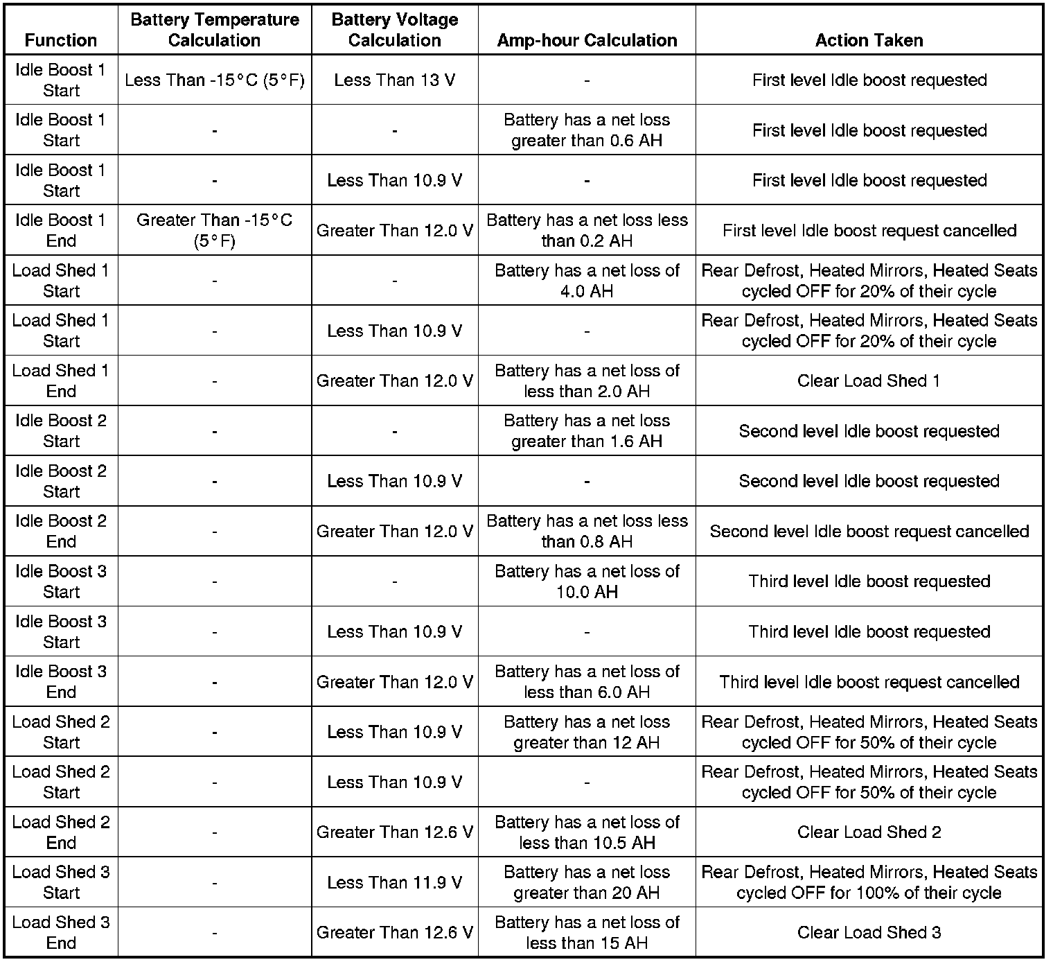 Each EPM function, either idle boost or load-shed, is discrete. No 2 functions are active at the same time. Idle boost is activated in incremental steps, idle boost 1 must be active before idle boost 2 can be active. The criteria used by the instrument panel module (IPM) to regulate EPM are outlined below: