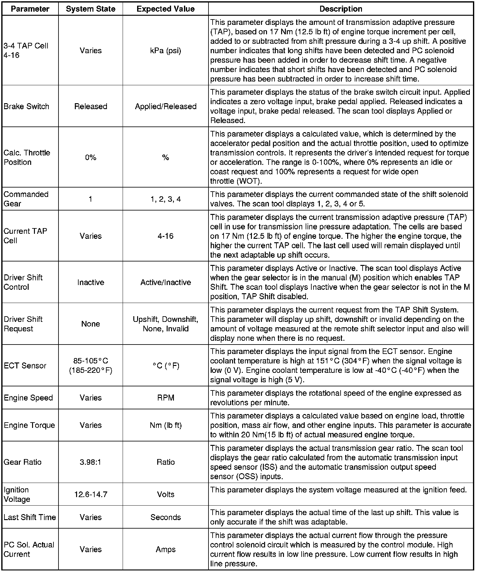 The Transmission Control Module Scan Tool Data List contains all transmission related parameters that are available on the scan tool. The list is arranged in alphabetical order. A given parameter may appear in any one of the data lists, and in some cases may appear more than once, or in more than one data list in order to group certain related parameters together.