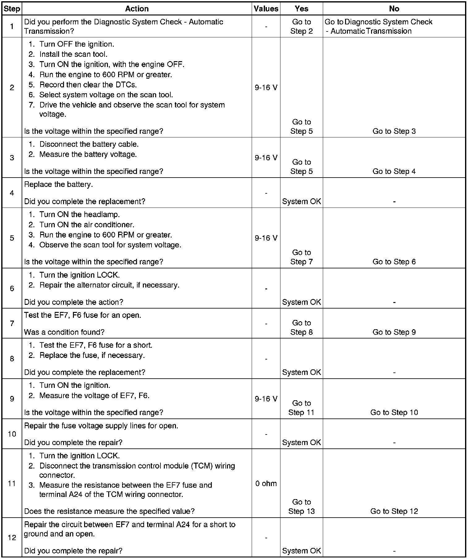 * The transmission control module (TCM) detects that voltage is less than 9 volts for 0.5 second continuously.