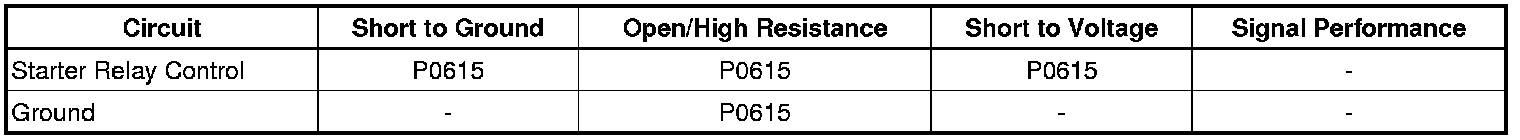When the ignition switch is placed in the START position the ECM verifies that the transmission is in Park or Neutral. If it is, the ECM then supplies 12 V to the control circuit of the starter relay. When this occurs, battery voltage is supplied through the switch of the starter relay to the start terminal of the starter solenoid. The ECM monitors the voltage on the starter relay control circuit. If the voltage is not what is expected, then DTC P0615 sets.